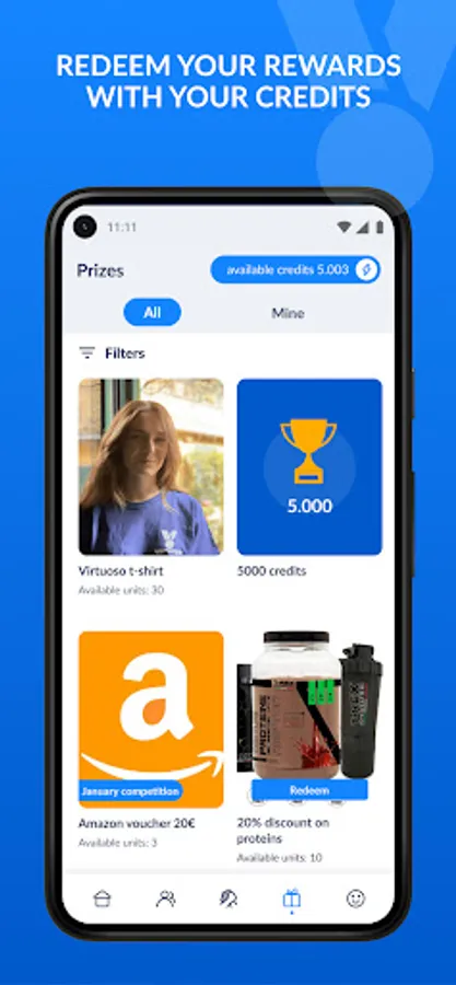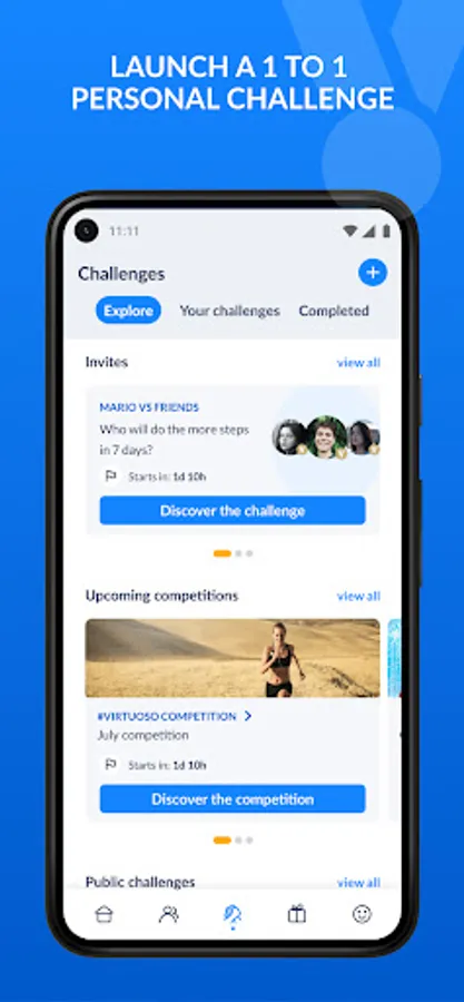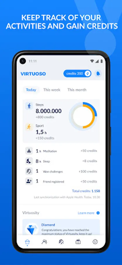 Virtuoso incentivizes and rewards your lifestyle thanks to your everyday activities. Walk, play sports, meditate, practice yoga and sleep well to receive credits that you can use inside the app to redeem free products, discounts and vouchers. You can challenge your friends in single or group challenges and you can also participate in your company’s challenge.