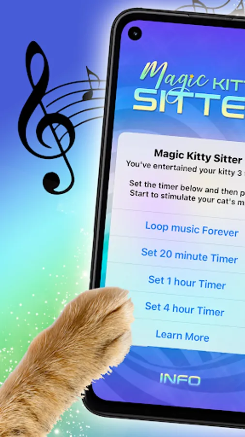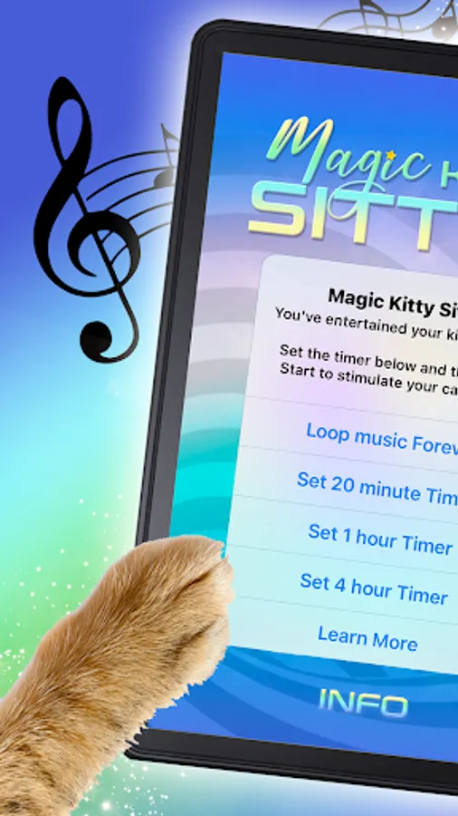 Magic Kitty Sitter plays dreamy, classical style music in a pitch and tempo that cats find fascinating.