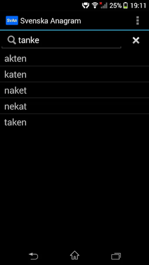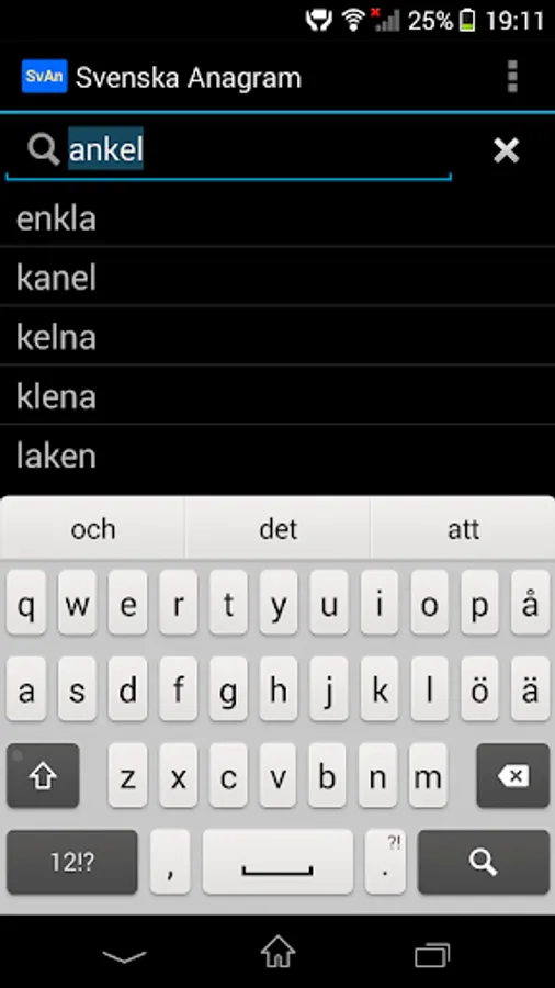 An app to search for Swedish anagrams based on a specified word. Requires internet access for advertising.