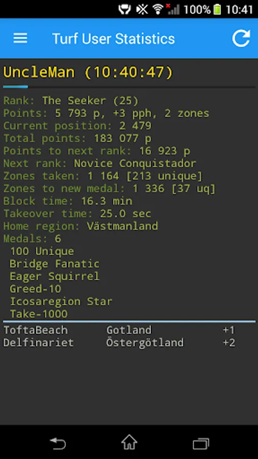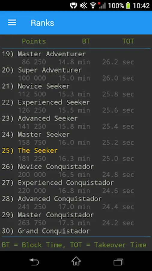 - List of all ranks, with needed points and the takeover time and block time for every rank. Current rank is marked with another color.
