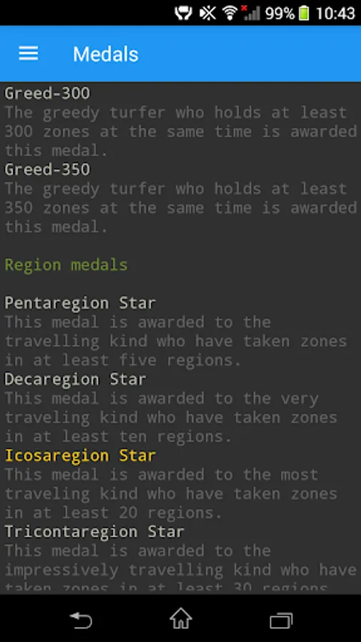 - List of all medals that can be achieved. Owned medals are marked with another color.