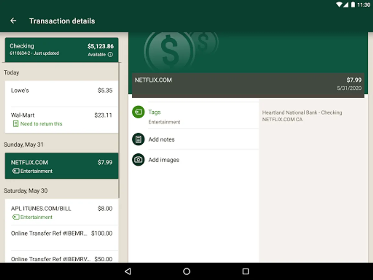 Add Tags, Notes, Images & Geo-Information: By enhancing transactions with custom tags, notes or photos of a receipt or check, you have the ability to stay organized and find exactly what you’re looking for when searching through your finances.