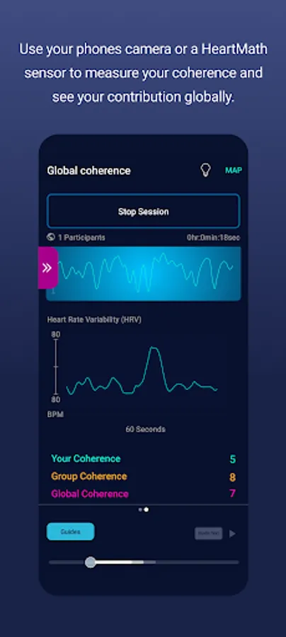 Using the optional HeartMath Inner Balance Coherence Sensor you can see and track how much heart energy you and others are adding to the planet and your own group.