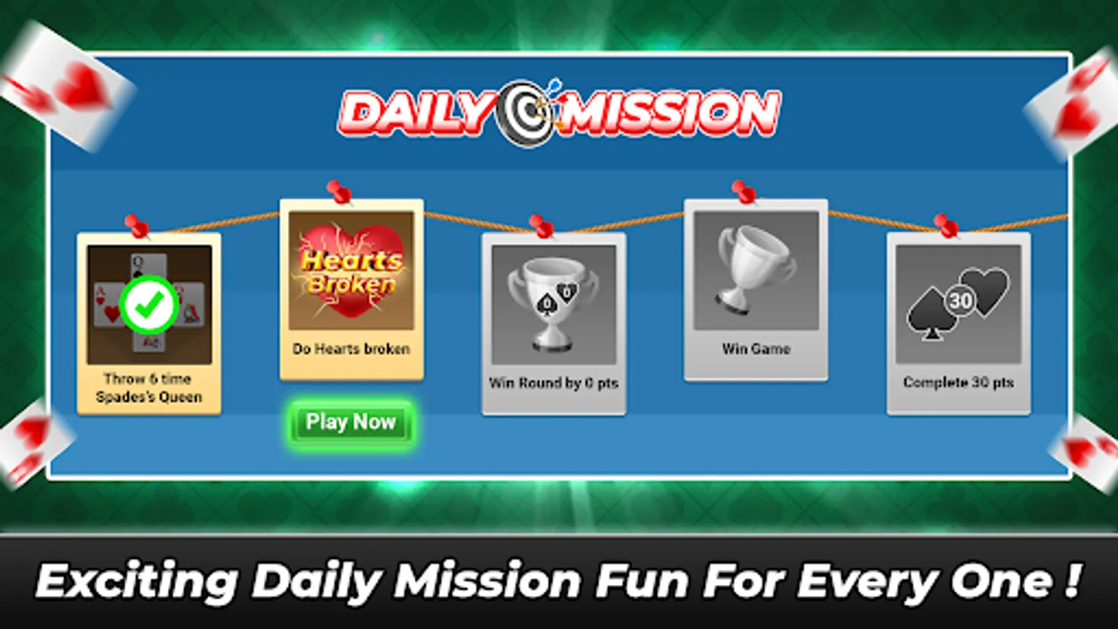 Free Offline Hearts is famous like other card game spades plus, cribbage plus euchre. Are you board to play other hearts online card game or hearts offline card game? 6Ace Games bring for you totally new features Hearts offline with smart UI and high competition. Complete the mission to get the high amount of completion rewards from it.