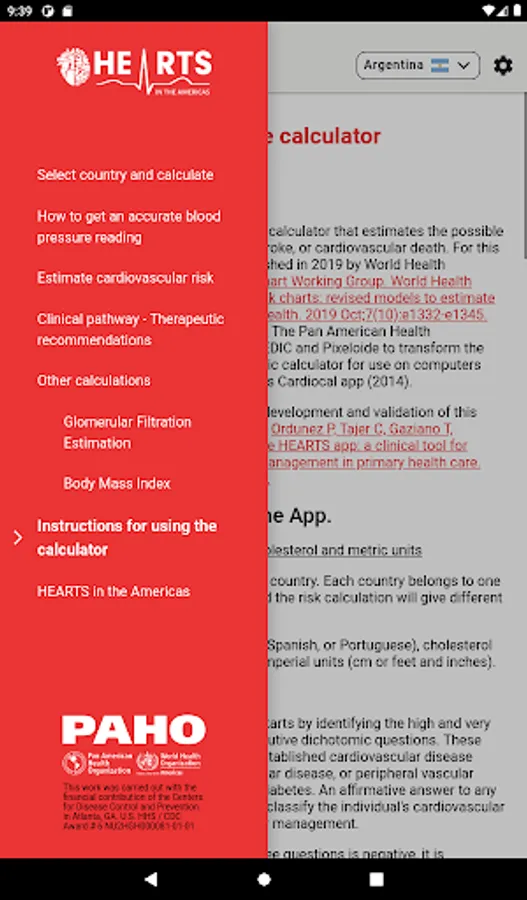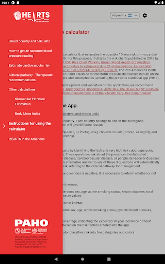 This FREE app is a cardiovascular risk calculator that estimates the possible 10-year risk of myocardial infarction, stroke, or cardiovascular death. It includes the six regions of the Americas (Andean, Caribbean, Central, North, South, and Tropical) according to tables published in 2019 by the World Health Organization (WHO) (Lancet, 2019). This risk score was based on extensive review of available cohorts and were adapted to 21 global regions based on analysis of the burden of cardiovascular morbidity. For each region, an estimate was published that requires knowing an individual's blood cholesterol level (or other information if the blood cholesterol level is not known). The Pan American Health Organization (PAHO), with the financial contribution of the U.S Centers for Diseases Prevention and Control, transformed the published color-coded tables into an online electronic calculator for use on computers and smartphones, updating the previous Cardiocal app (2014)