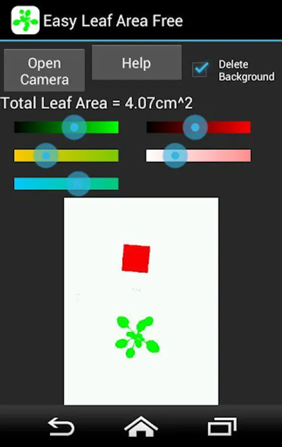 Easy Leaf Area Free measures leaf area non destructively in seconds. Place a 4 cm^2 red piece of paper next to your leaf and take a picture. Make sure your leaf and scale are in the same plane and are parallel to your android device. Leaf area is calculated automatically from green leaf and red scale areas. Adjust the sliders to correctly identify green leaf and red scale areas.