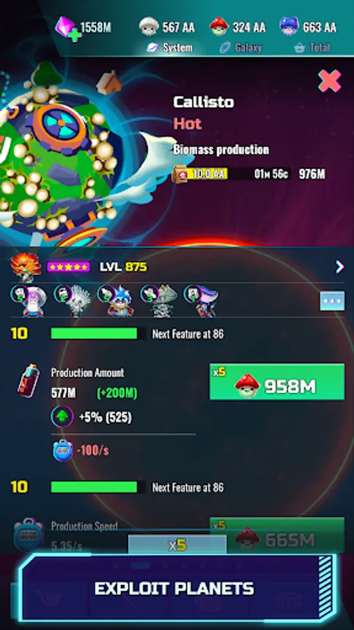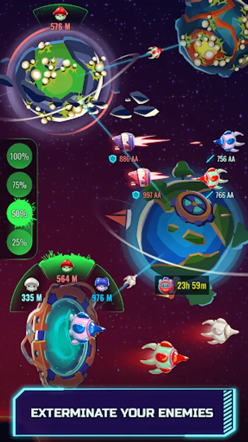 The galaxy is not empty! It was already colonized by your awful oppressors! Grow your soldiers and fight with them in battles for resources and territories! Organize war expeditions to other systems and galaxies and bring back the resources your shrooms need.
