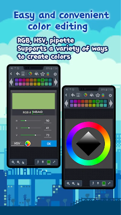 → change a color from palette by using the eyedropper (spoide), HSV, RGB