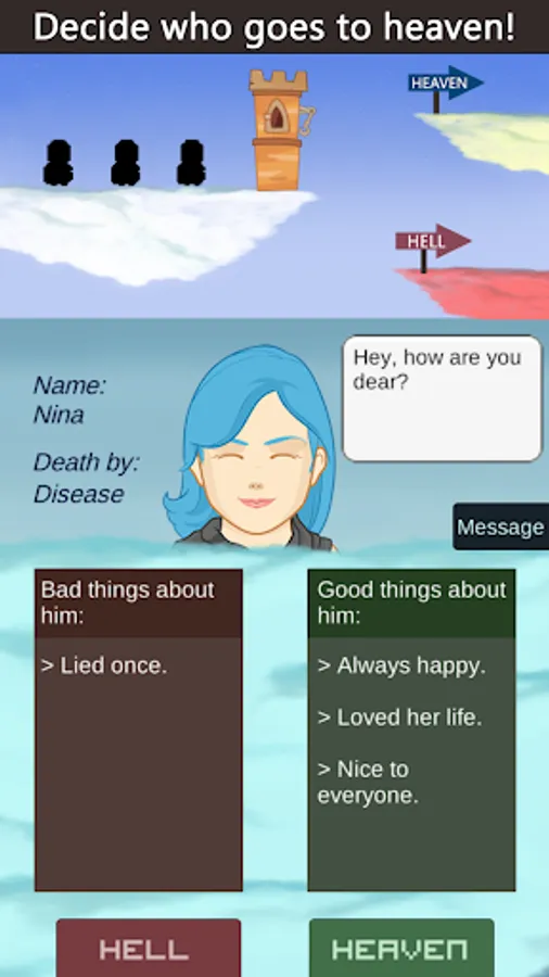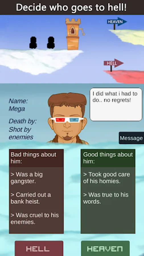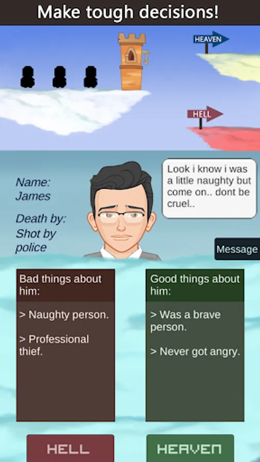 This is an afterlife adventure where you play as an angel of death and decide people's faith. You have the power to decide who goes to heaven and who goes to hell in afterlife. Judgement day has arrived, angels of heaven are counting on you while satan and devils have an agenda of their own.