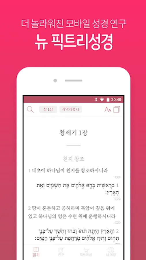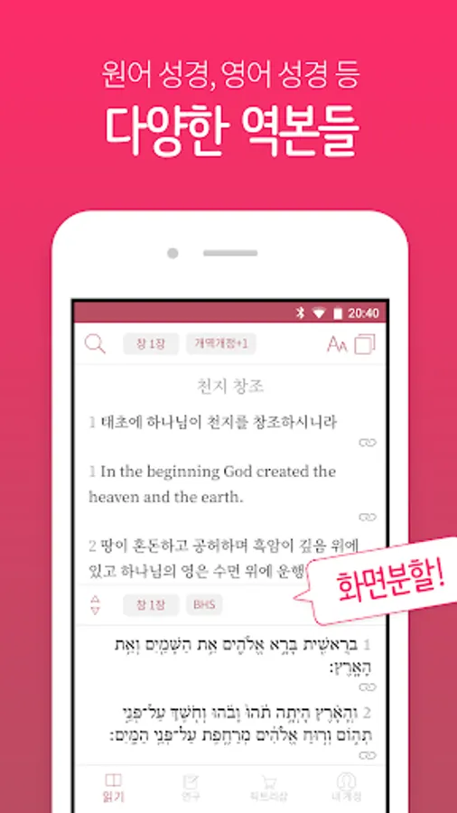 You can select any number of translations to read together on one screen. Contrast both Korean and English Bibles, Hebrew, and Greek translations. Also, take advantage of the dual-mode feature that allows you to view the screen in two.