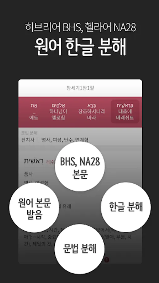 The most standard Hebrew transliteration, BHS, and Greek transliteration NA28 have been released with Korean text decomposition (Grammar Decomposition, Korean Bible Contrast, Hangul Reading).