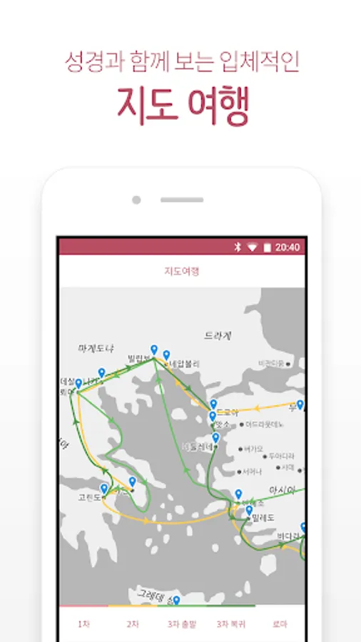 Through the 'Map Travel' menu, you can explore each location, location and historical path of the Bible.