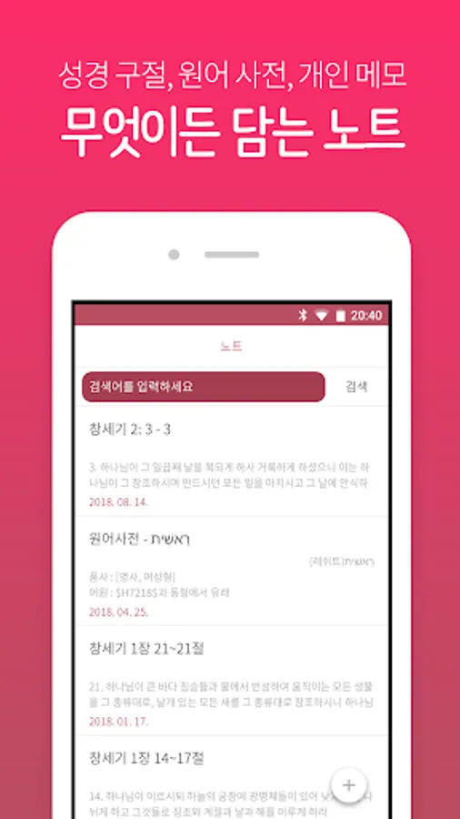 You can underline the words you want to remember and write, and you can write notes. You can add any number of Bible verses in one note, and you can also include original dictionary content. Also, of course, you can freely put your own notes. Modify the subject of the note to be studied, continue to add passages, and create your own list of notes. If you use Evernote, you can send each note to Evernote.