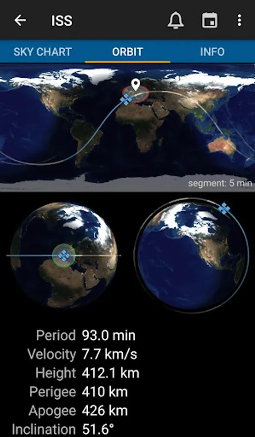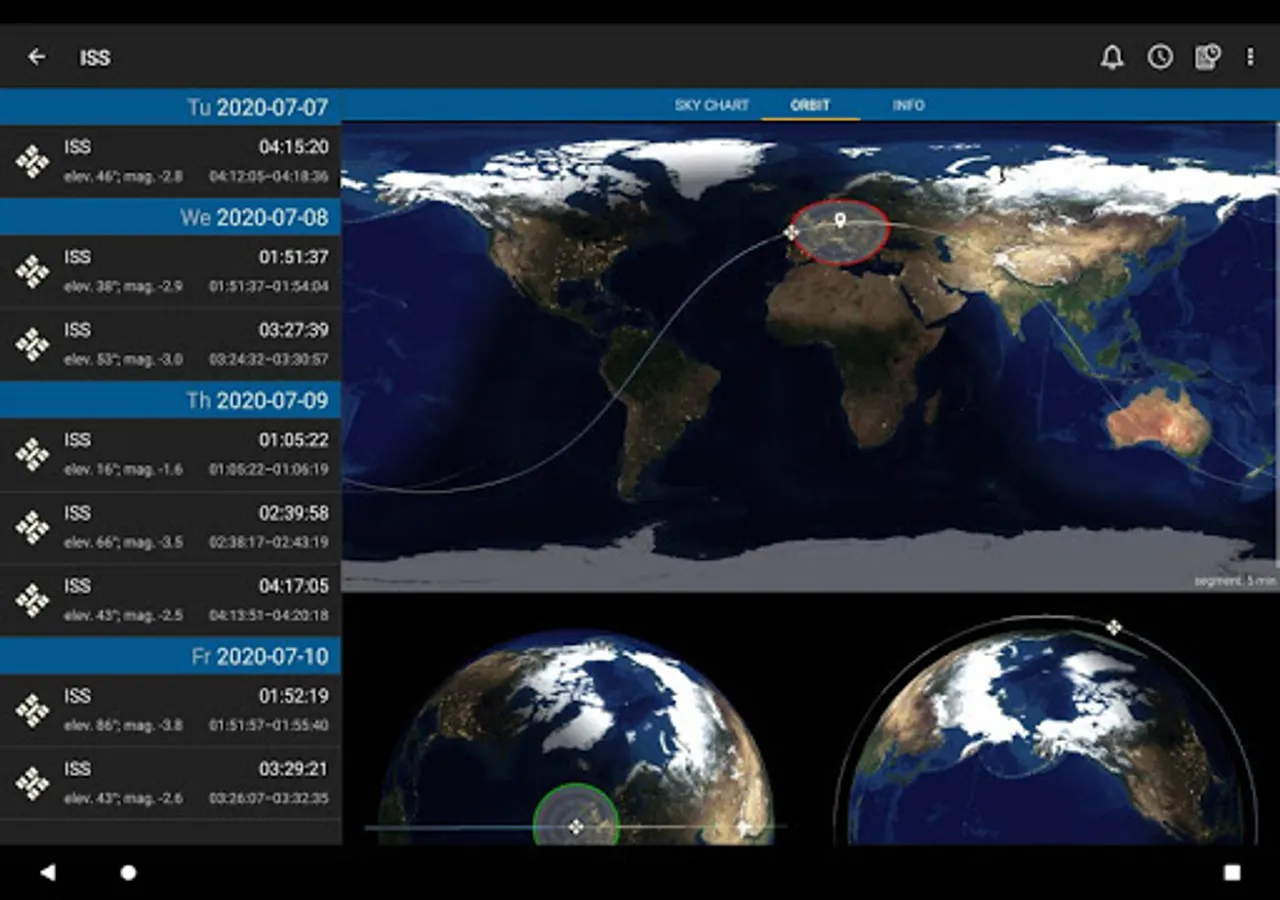 Get a visual overview over passes and animate the position of satellites on the sky chart and on the ground track.