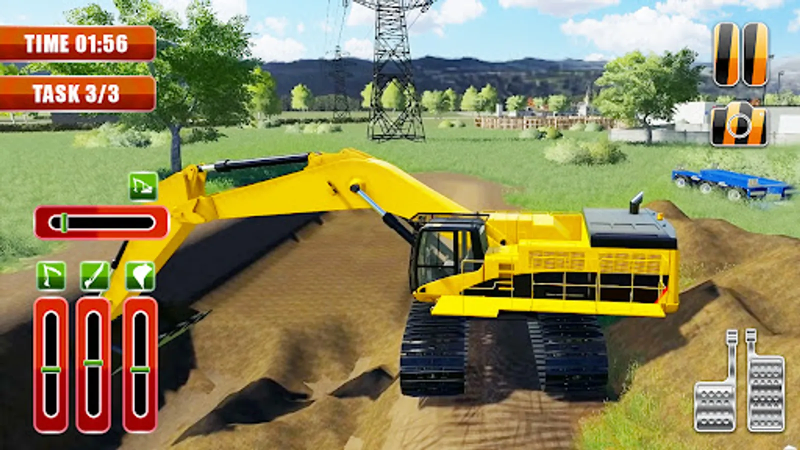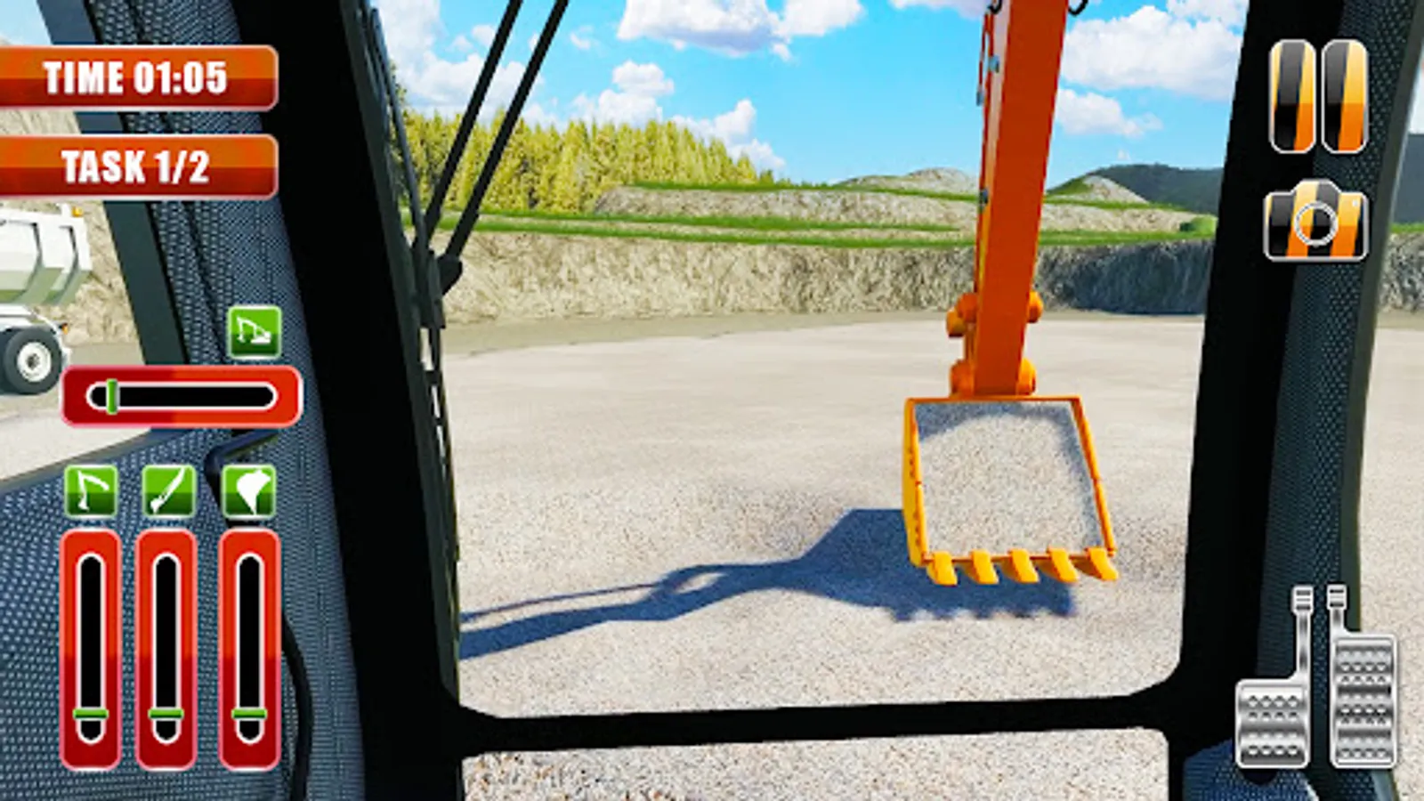 Operate the Heavy Excavator crane and load the goods in the heavy construction truck and transport the truck, fill the truck with sand by using Heavy Excavator crane and transport the sand truck to construction area and help the humans to build the city with in the time.