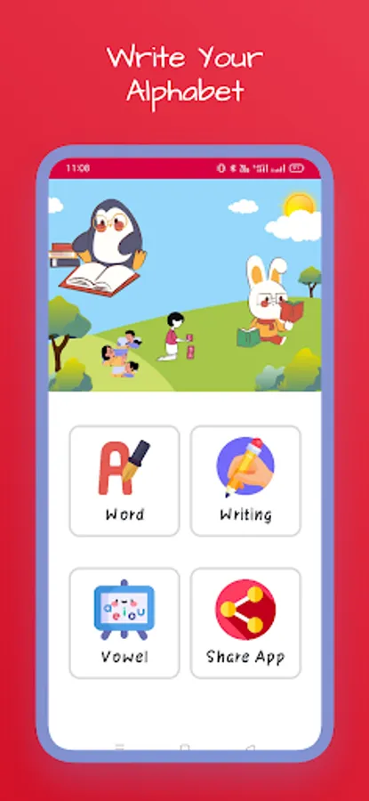 The Hebrew Alphabet Writing(כתיבת האלפבית העברי) application has a total of three sections. They are WORD, WRITING, and VOWEL sections.