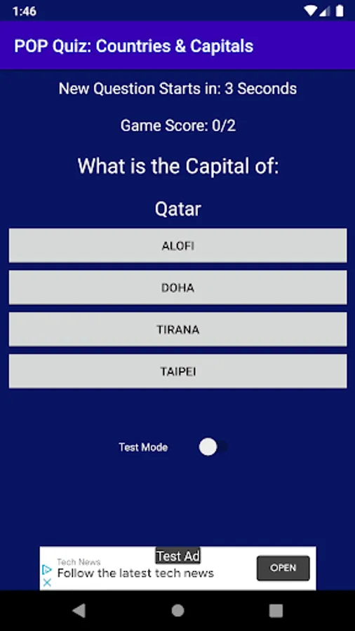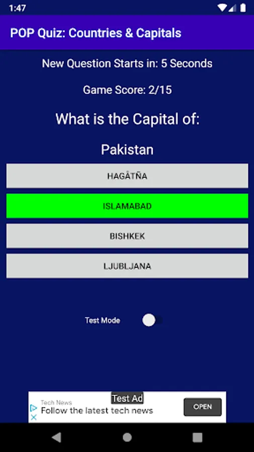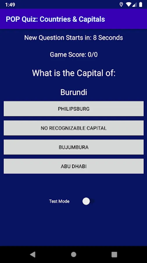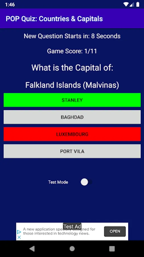 The Test mode is timed and presents a new question every 10 seconds whether you made a guess or not and the score is incremented accordingly. Any wrong or no guess is treated as a failed guess.