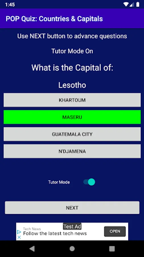 What if you have no knowledge of the World Countries and their respective capitals? You got you covered. Just as in the Math Pop Quiz from HecaWorld unLTD, the Countries & Capitals Pop Quiz comes in two flavors. The Test mode and the Tutor Mode.