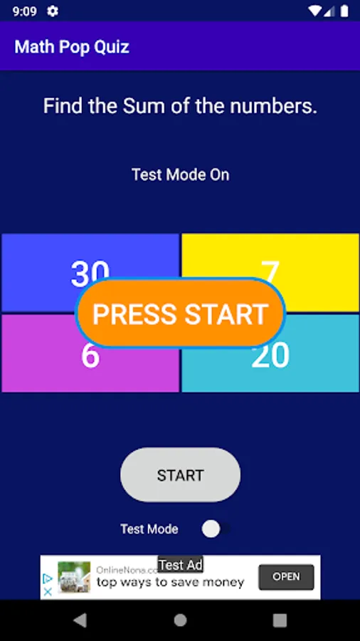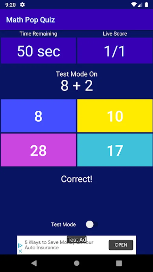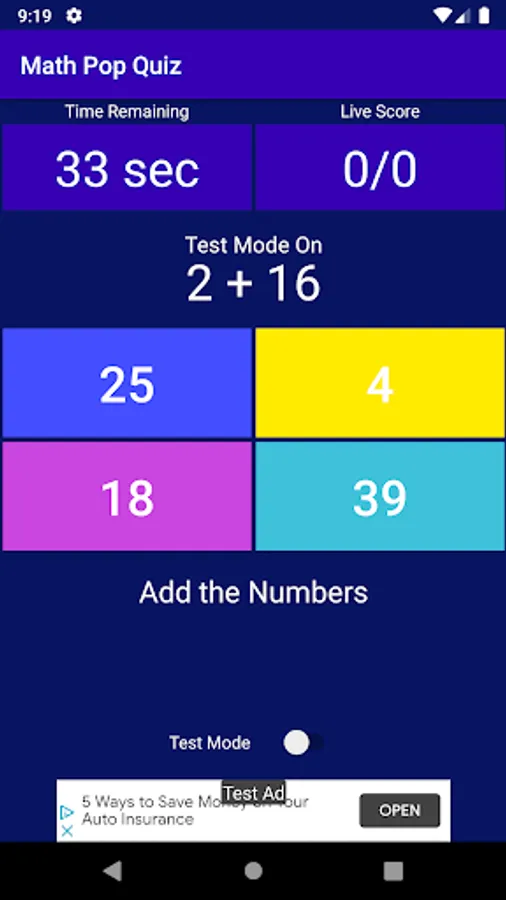 The Test Mode challenges your ability to do mental math on simple numbers and tracks your score and provides you an overall percentage score at the end of one (1) minute.