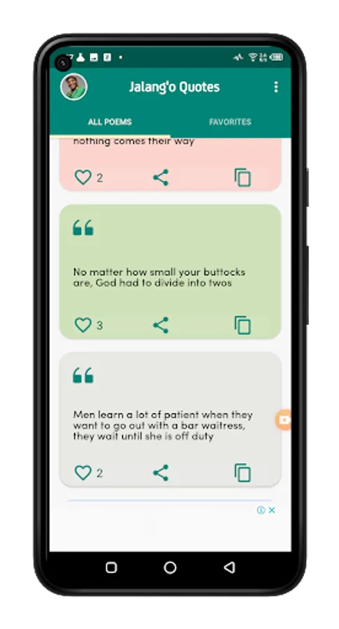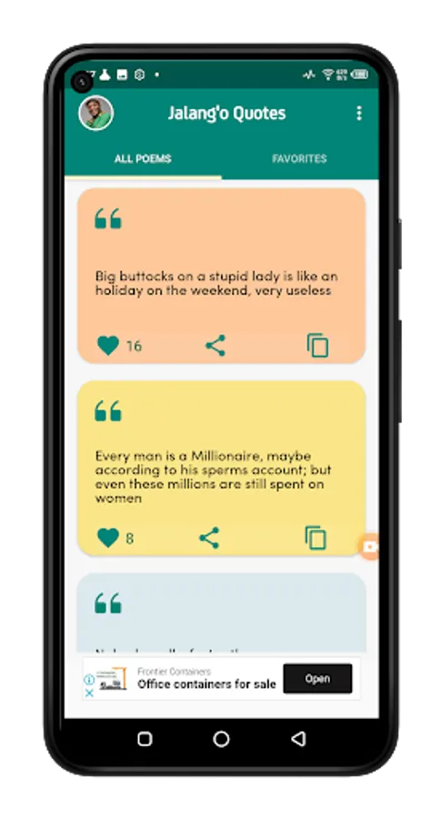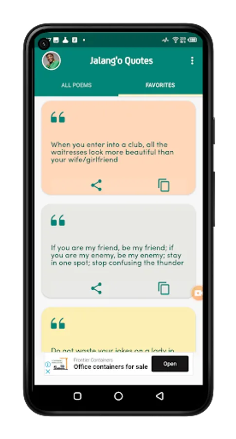 This is an app of quotes from Kenyan top comedian Felix Odiwuor, popularly known as Jalang'o. The quotes are always retrieved from his radio shows, stand up comedy shows among other events.