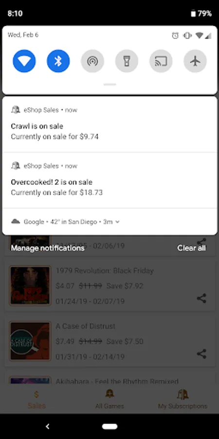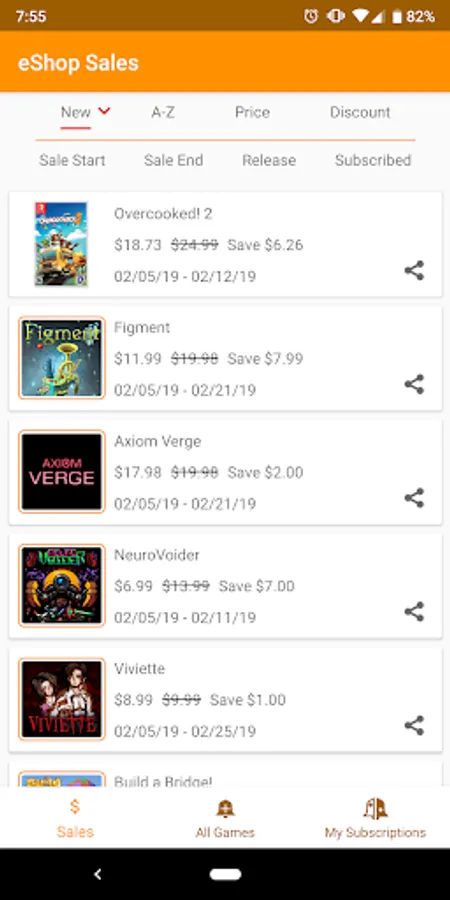 With eShop Sales you can quickly see all the best sales form the eShop. Search and subscribe to any released game, and get a custom notification when it goes on sale. You can upgrade to gain access to additional features like custom price alerts, additional filters, and notifications for every game deal.