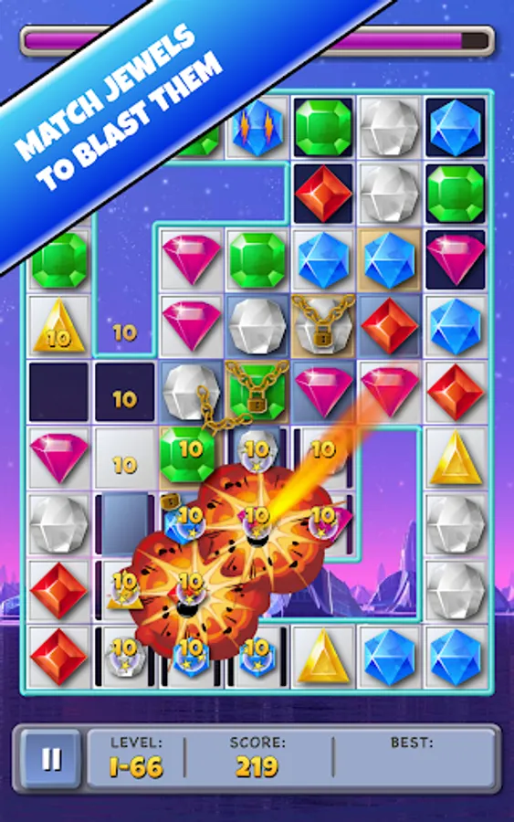 Match 4 or 5 jewels to get bomb or magic jewel. Use bombs, magic jewels and flashes to hit more jewels. Match clock jewels to extend your time.