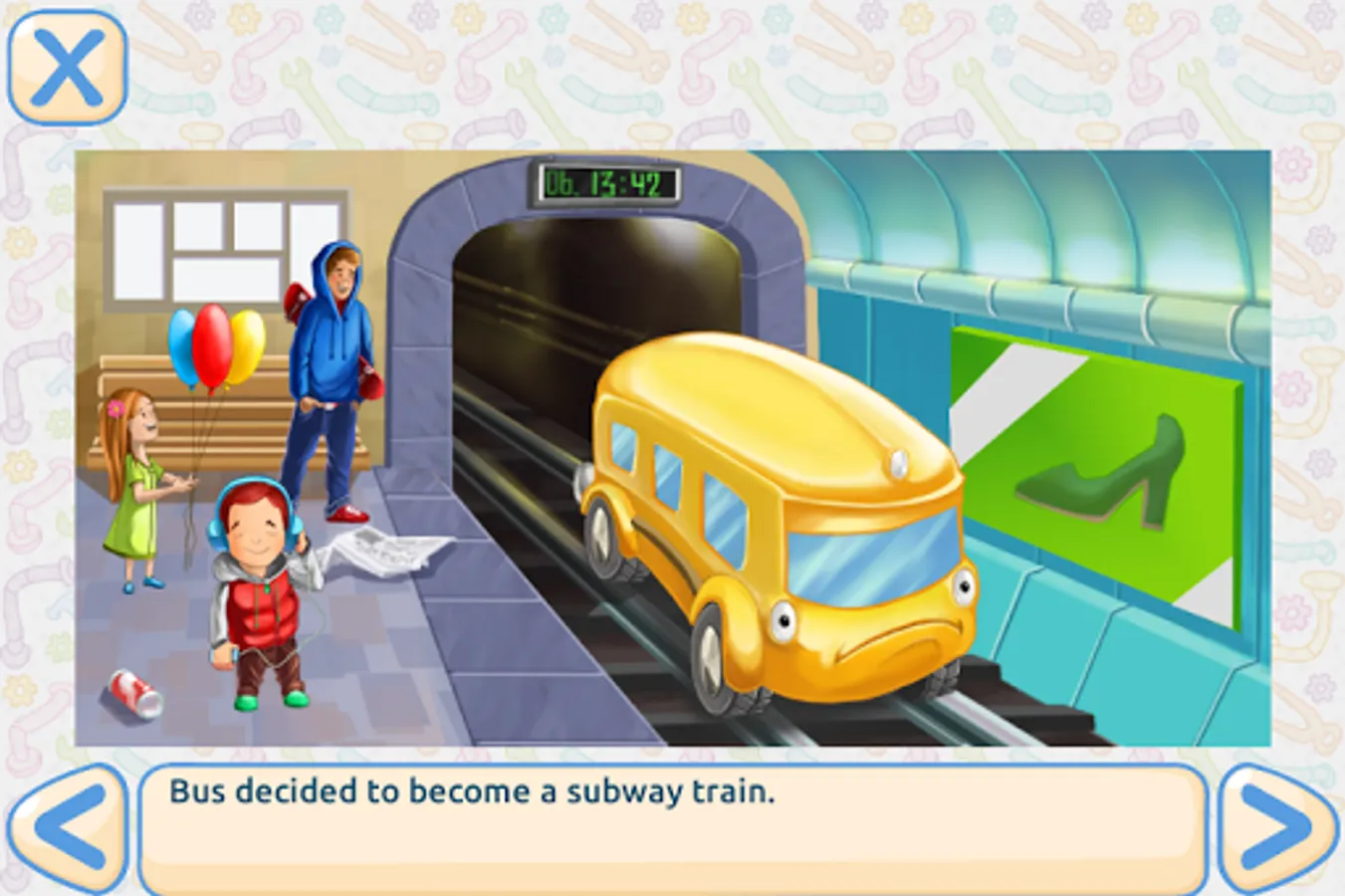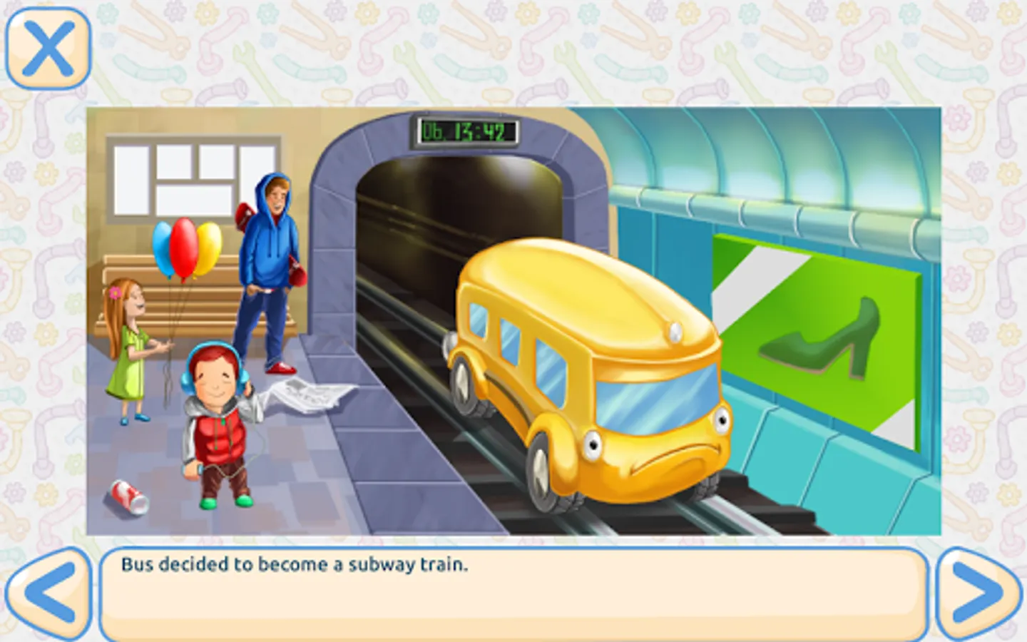 An interactive story with educational games for 4-6 year olds. The main character of the game is a bus which people don't need any more and leave at a junkyard. But the bus wants to be useful in some other way. It tries to become a helicopter, a truck and a subway train, but fails. In the end it manages to find its purpose. It's a kind, fun and educational story which teaches small kids that there is a solution even to hard problems. Also, it educates children about the pollution traffic causes in cities. The story includes educational tasks to train brain functions: attention, memory and logic.