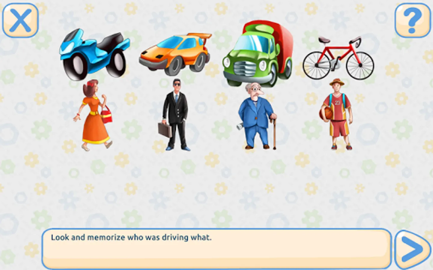 Memorize who drove what (develops visual memory),