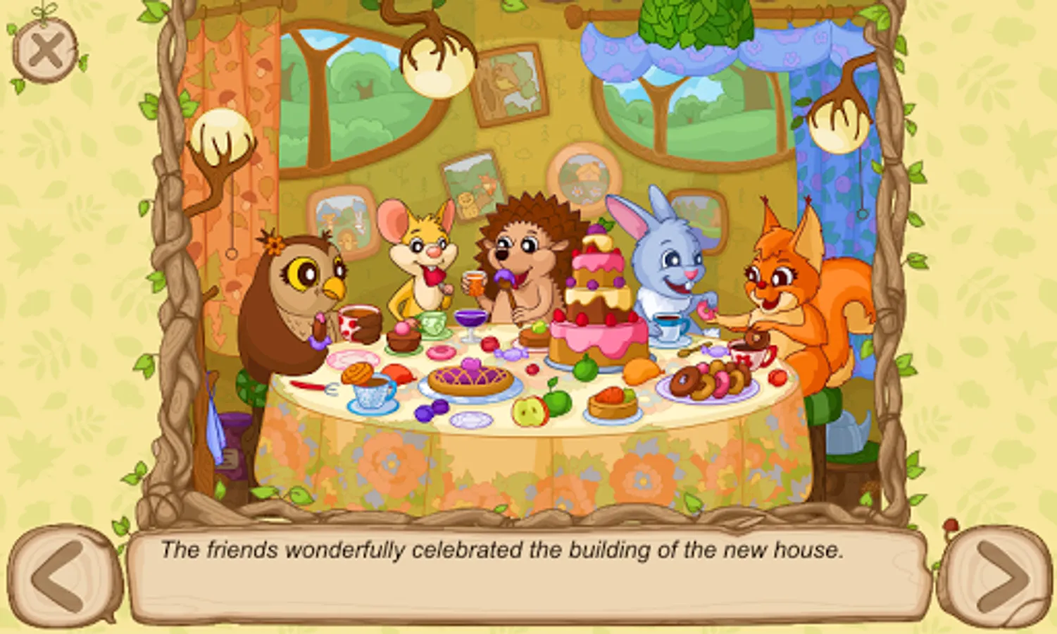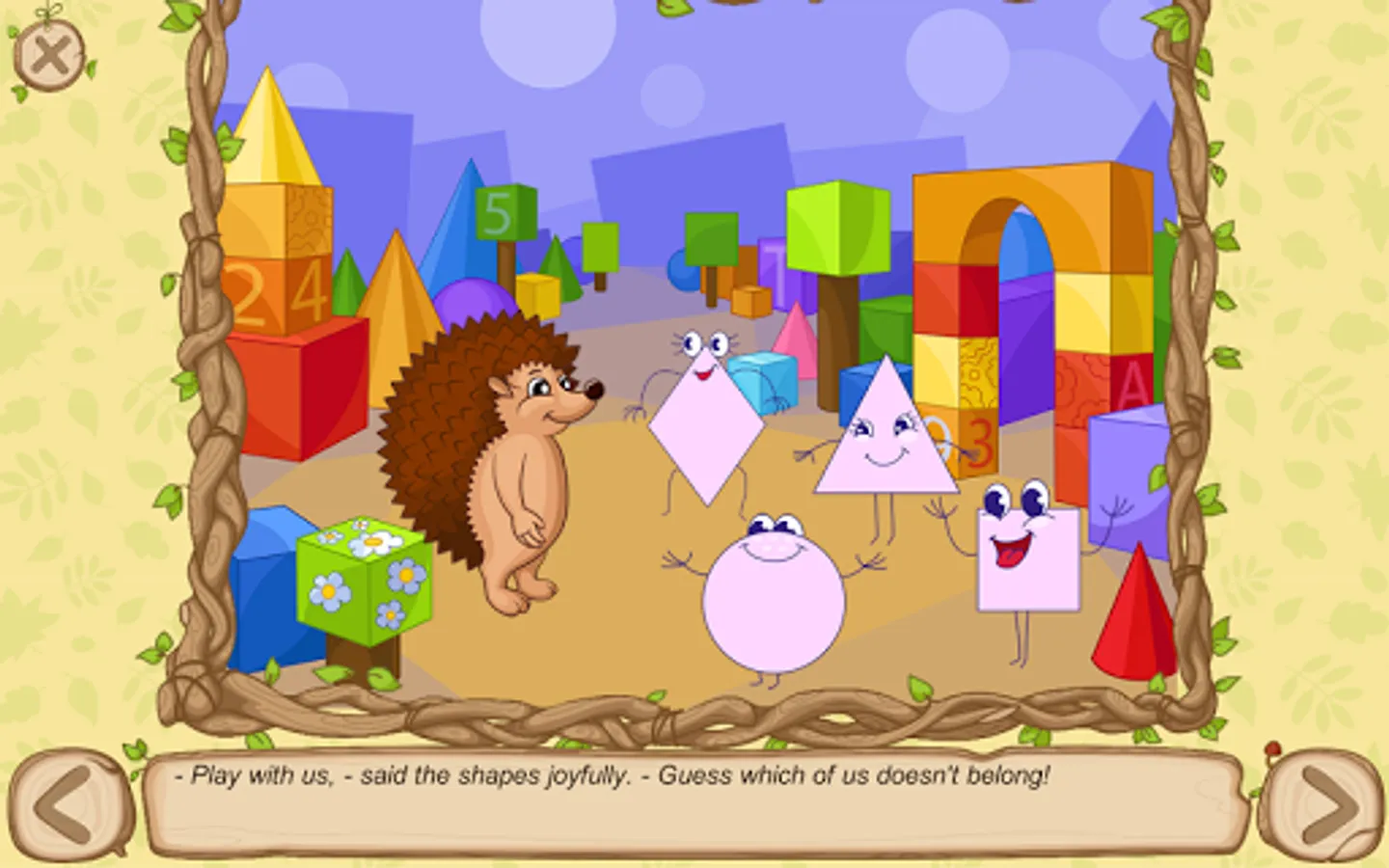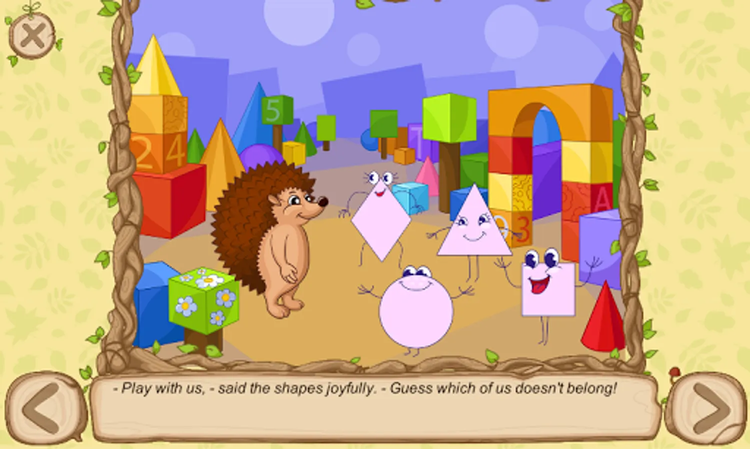In the beginning of the story, Hedgehog sets off to find the lost shadow of his friend, Mouse. After returning from the journey, he cleans up his house while Squirrel helps him. Then Hedgehog attends Hare's birthday party. In the night, he dreams that he visits a geometry land and gets to know the shapes that live there. In the end of the story, Hedgehog and his friends build a new house in the forest. Such an interesting narrative has sure made this free logical games app for kids as one of the finest preschool logic games that you can download for the kids.