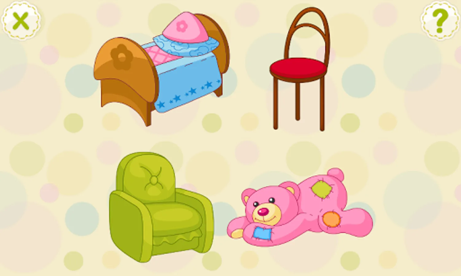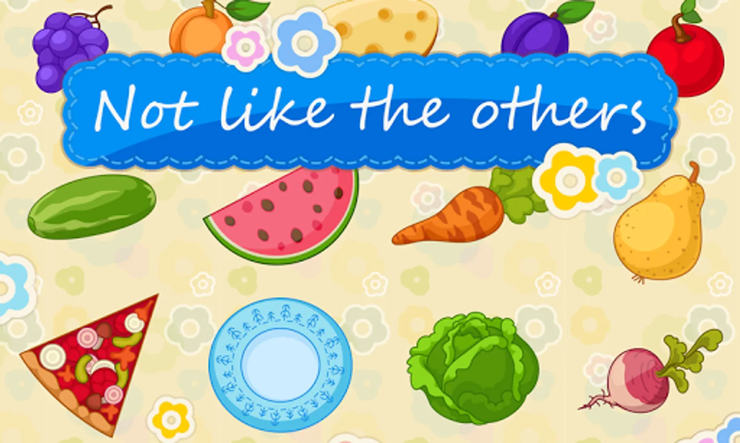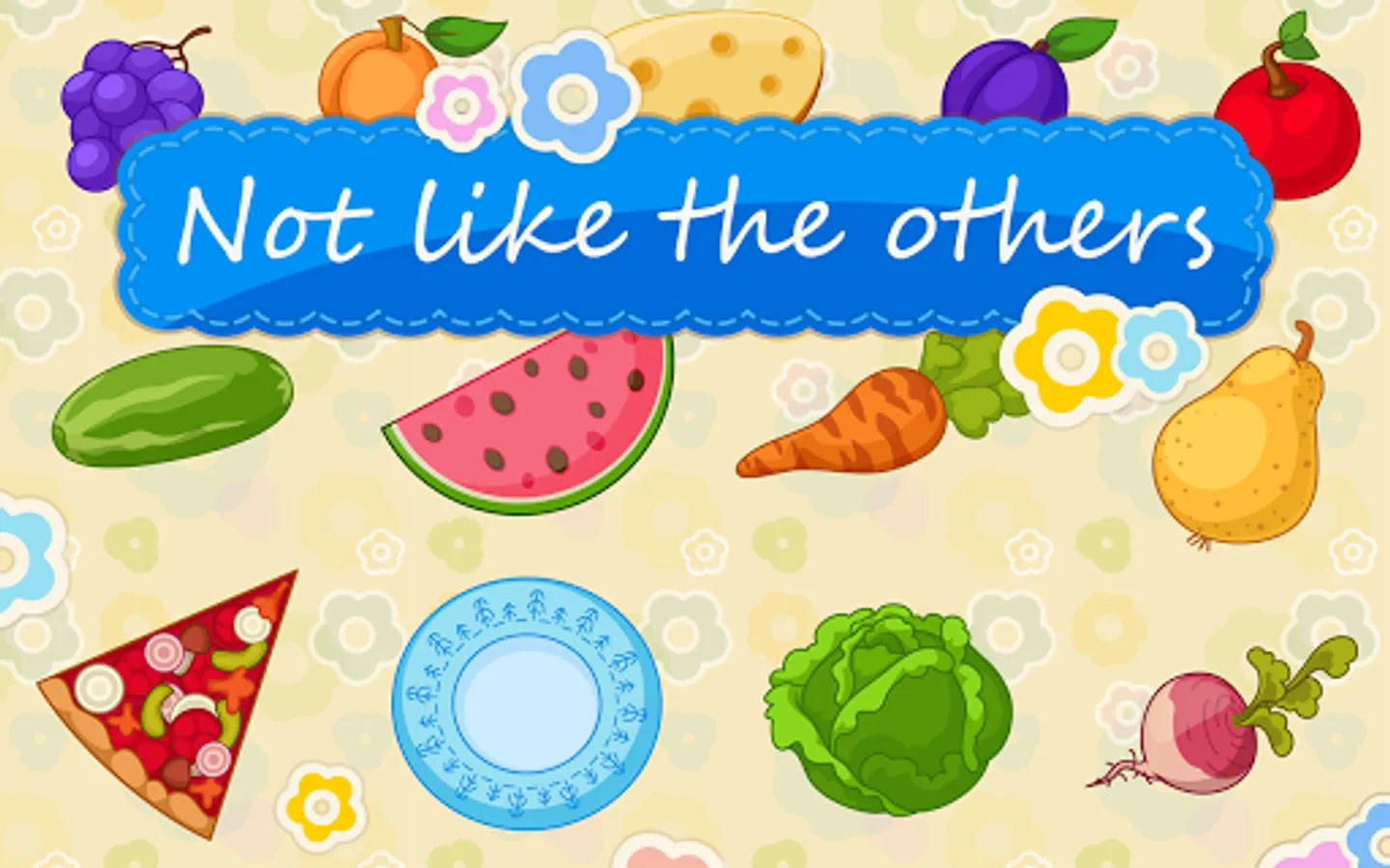 Each round there are 4 objects presented on the screen, 3 of which have something in common— thus uniting them into a category. The category always has a name (for example: furniture, toys, fruits). The fourth object doesn't belong to that category and is "not like the others"—the kids need to identify it.