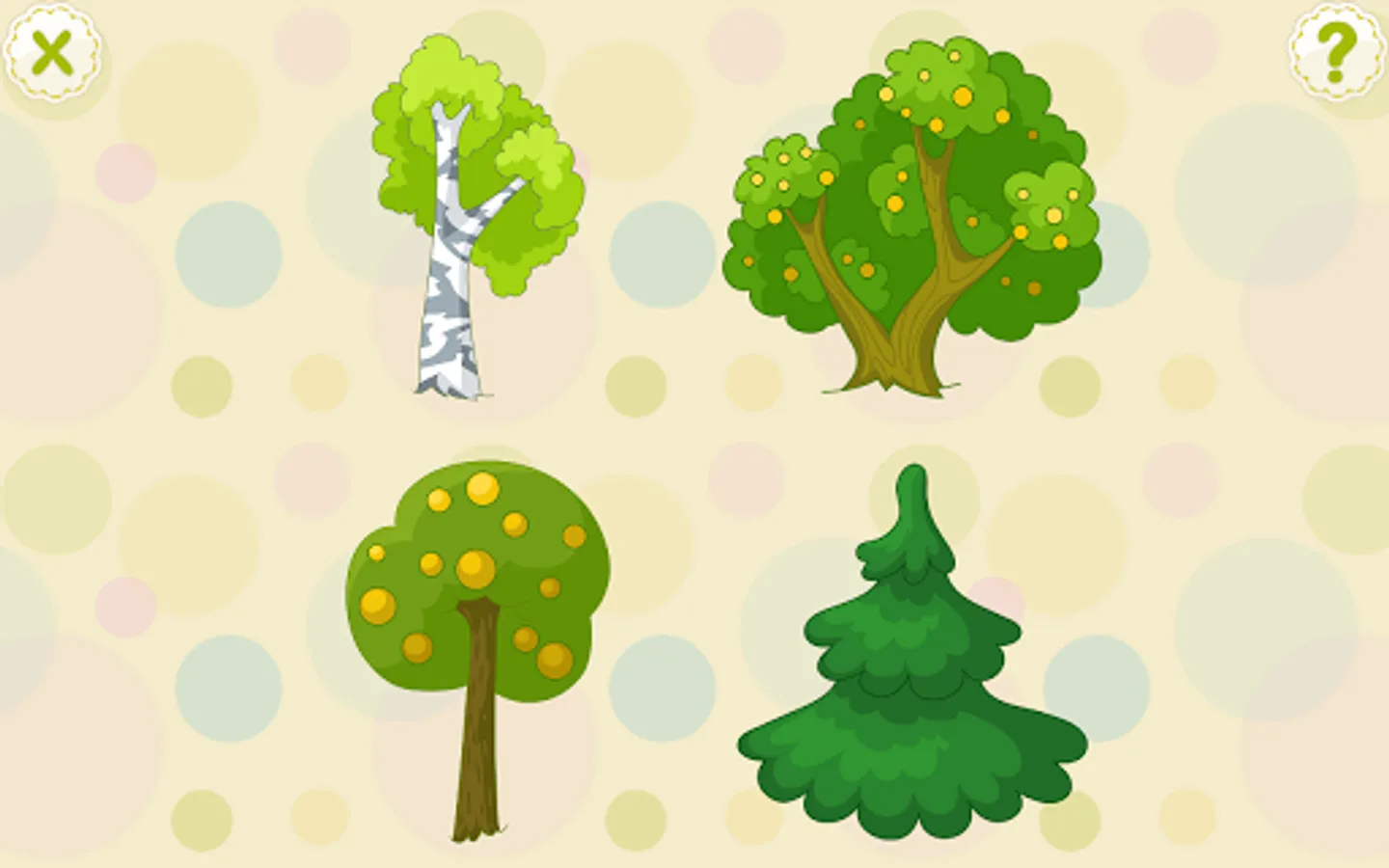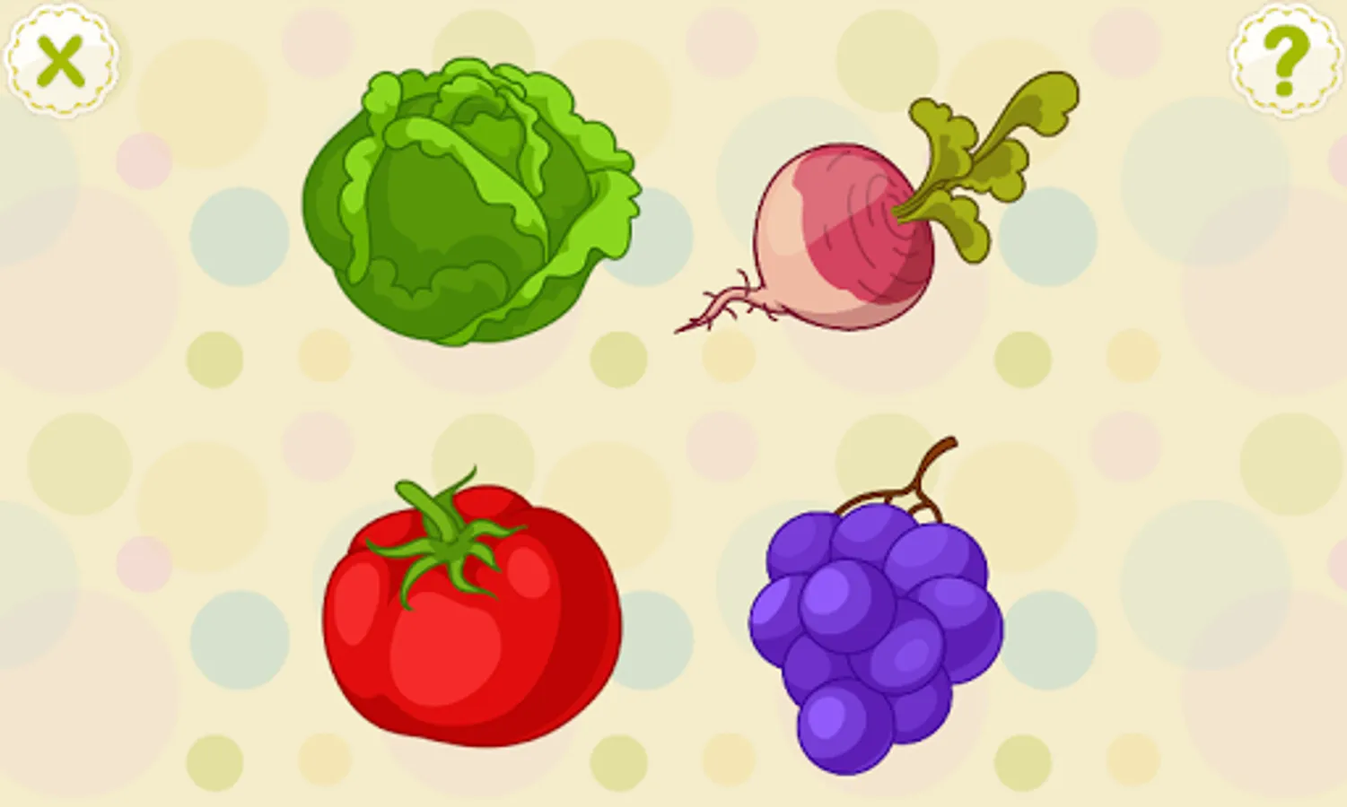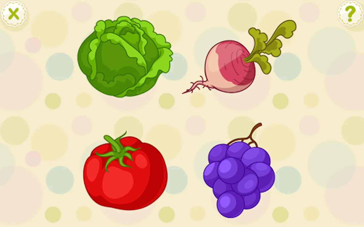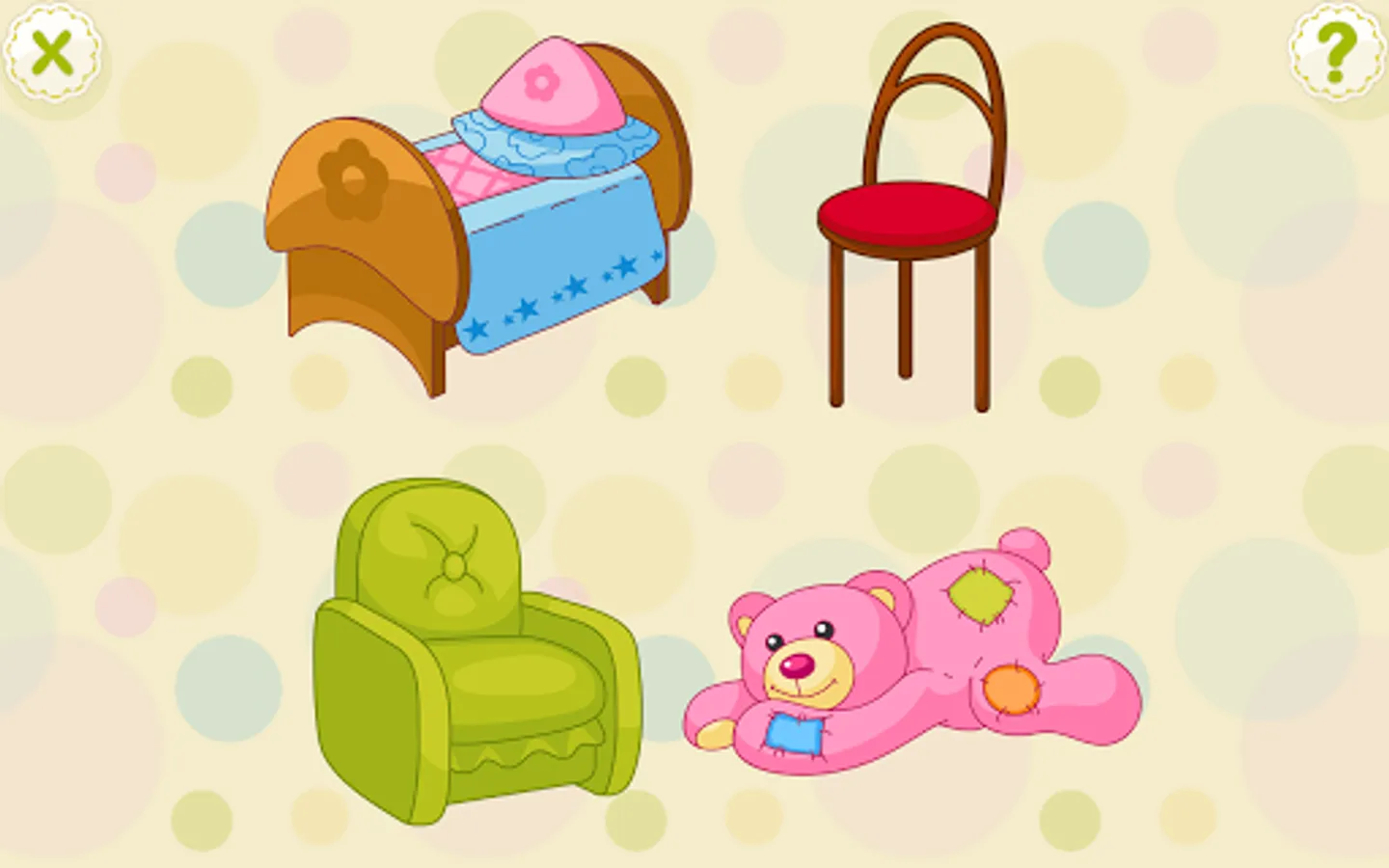Each round there are 4 objects presented on the screen, 3 of which have something in common— thus uniting them into a category. The category always has a name (for example: furniture, toys, fruits). The fourth object doesn't belong to that category and is "not like the others"—the kids need to identify it.