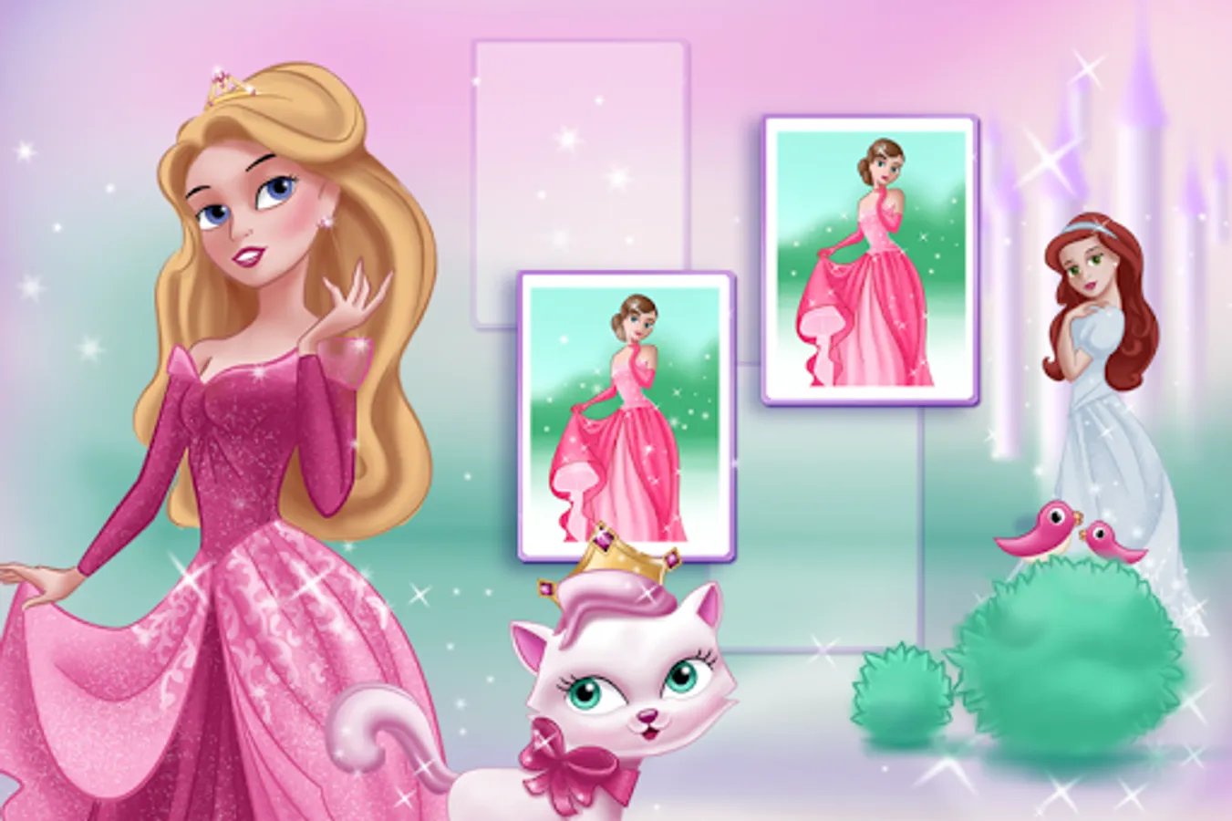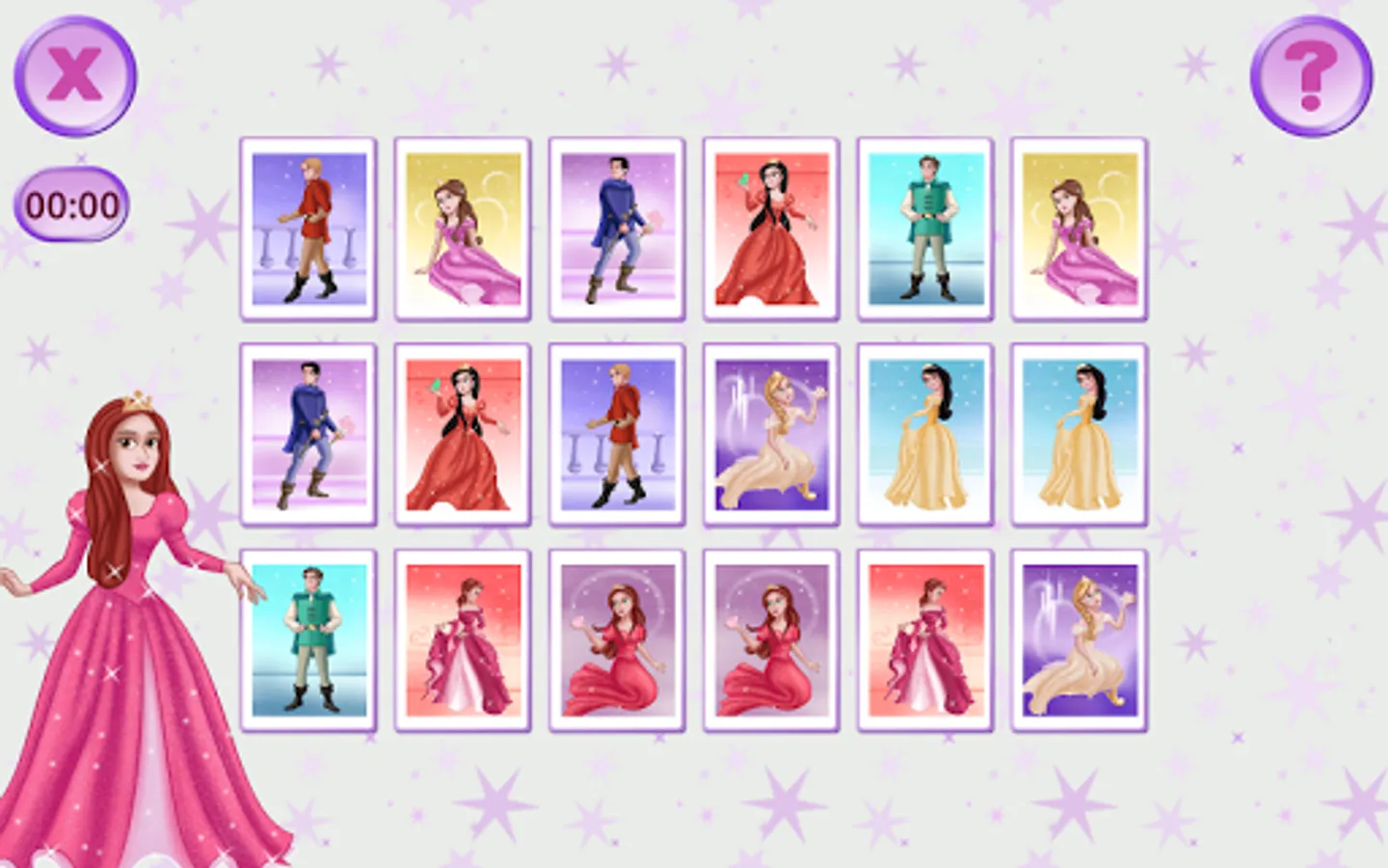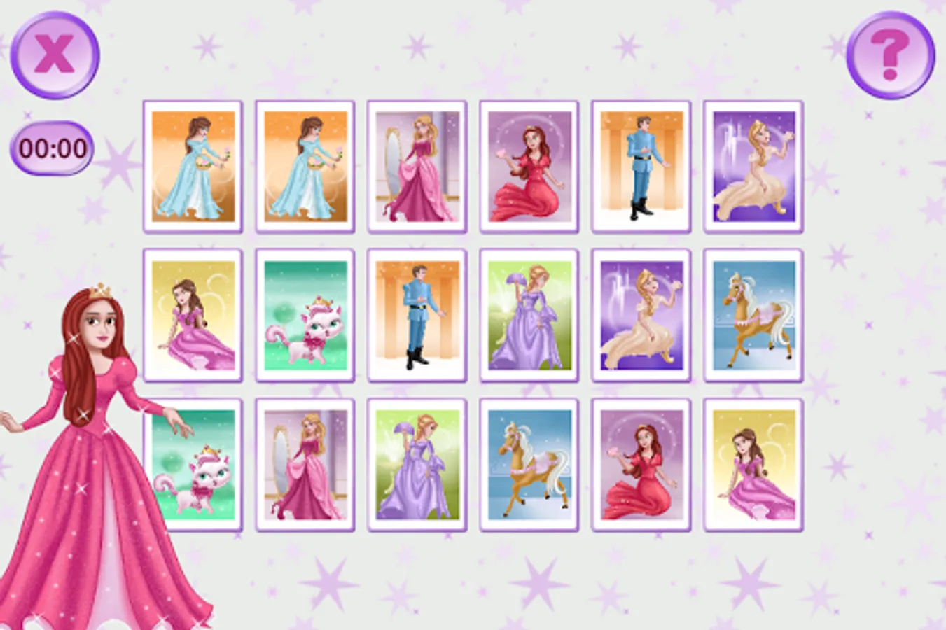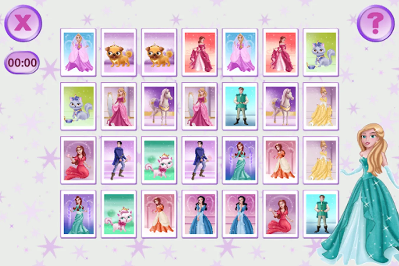Press any 2 cards, and they will flip. If both cards have the same princesses, they will stay open. If the pictures are different, the cards will close again. Your task is to keep opening cards randomly to memorize the pictures on them and finally open all the cards on the field.