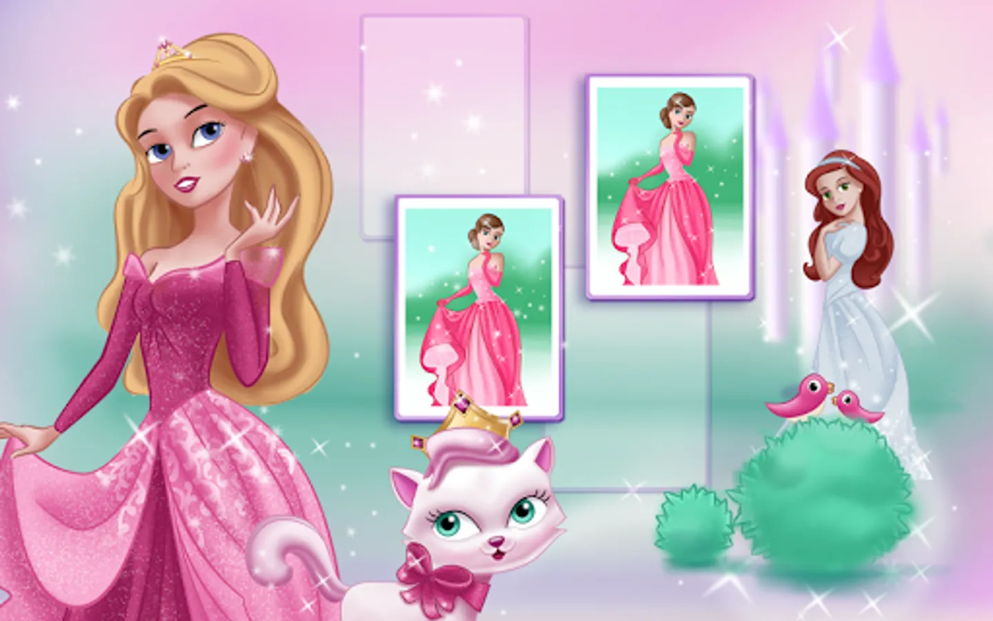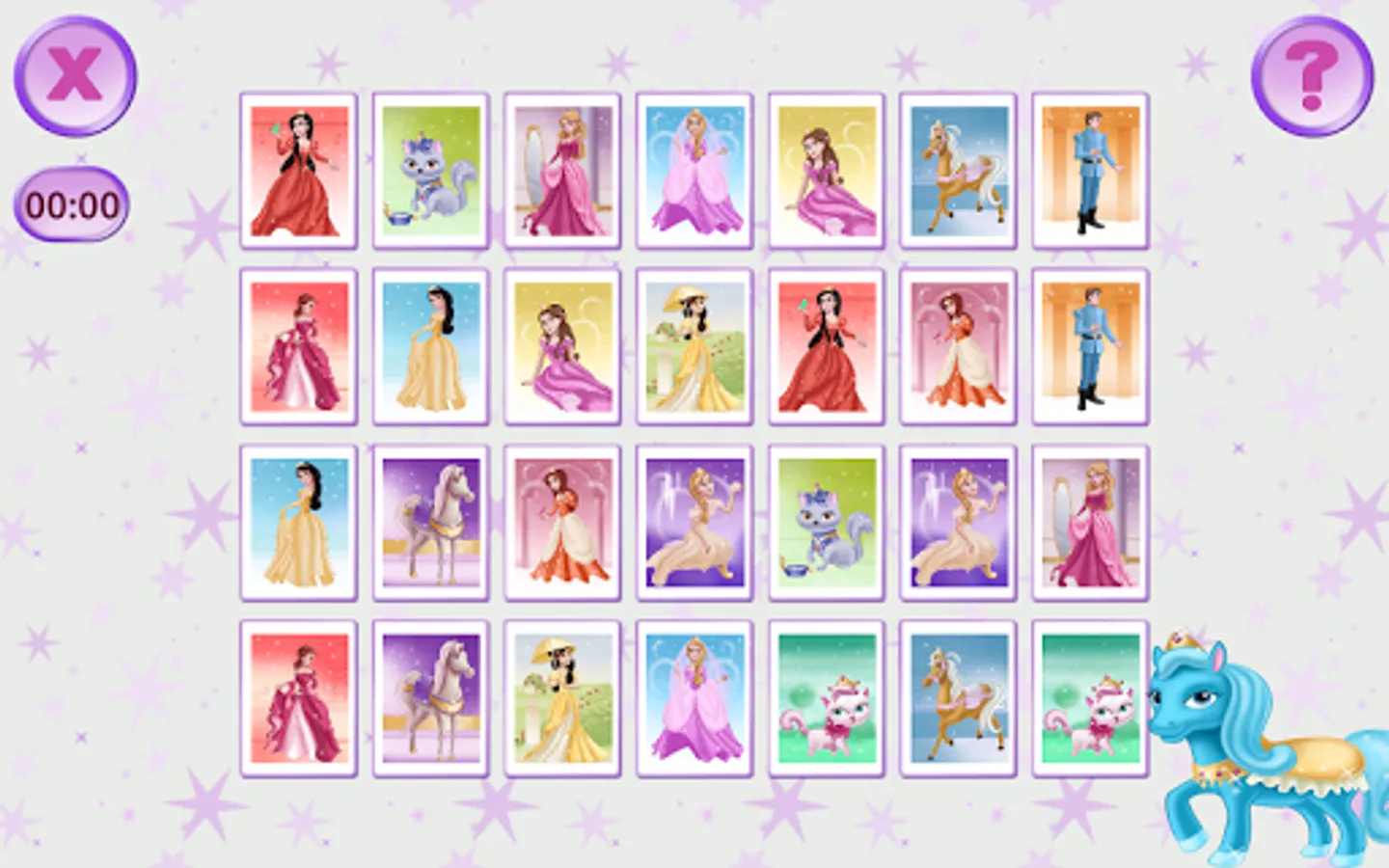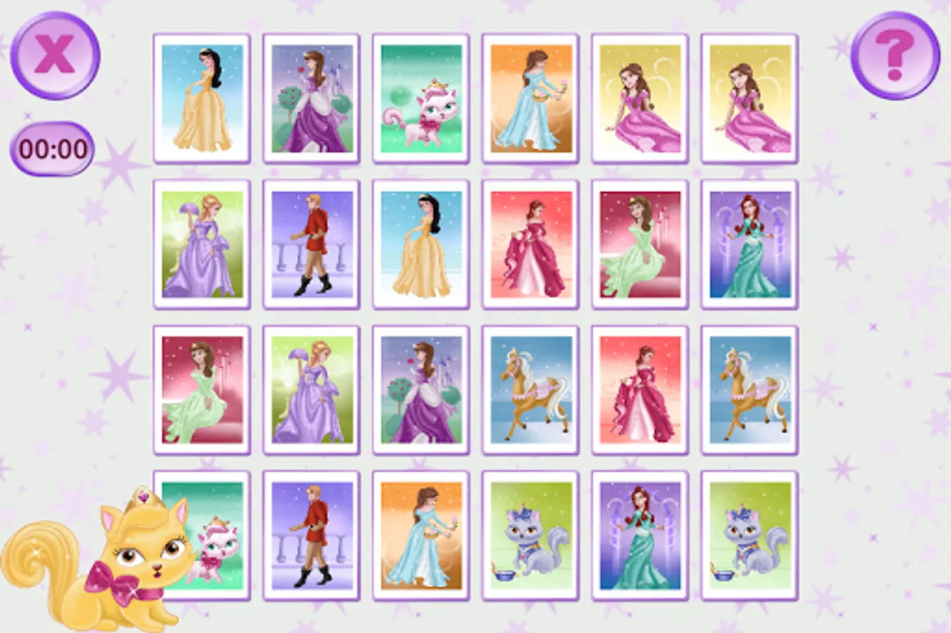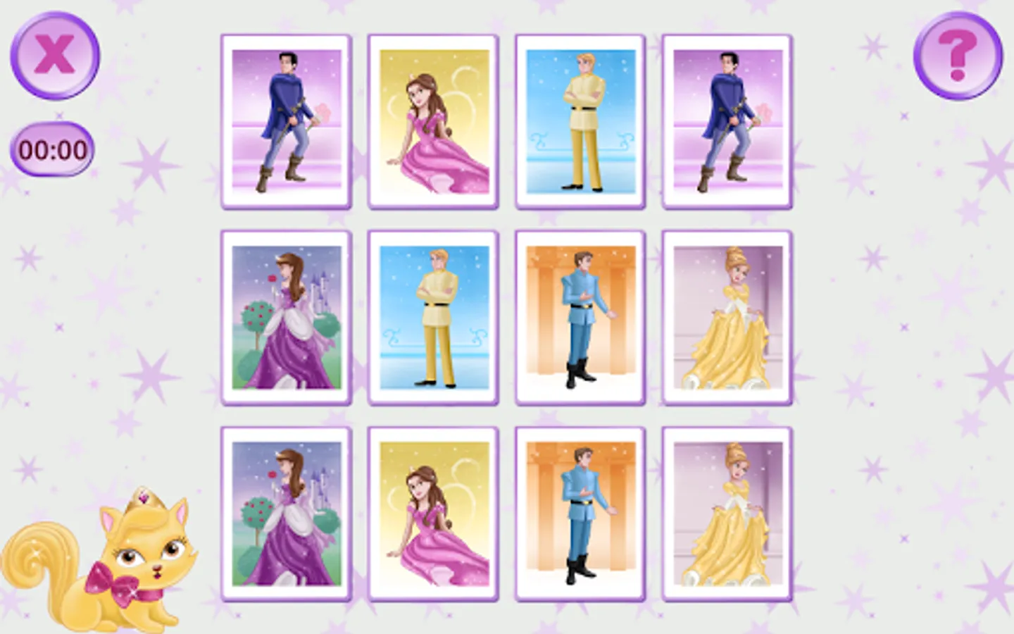 Press any 2 cards, and they will flip. If both cards have the same princesses, they will stay open. If the pictures are different, the cards will close again. Your task is to keep opening cards randomly to memorize the pictures on them and finally open all the cards on the field.