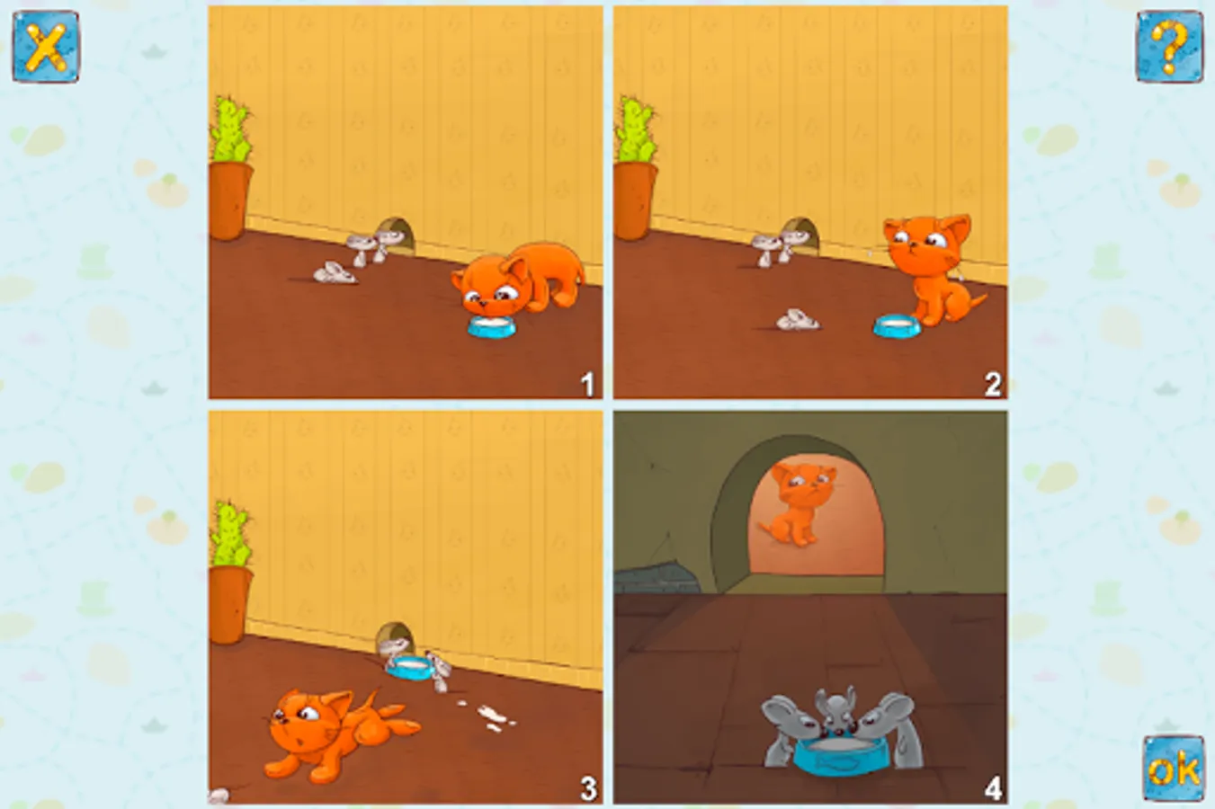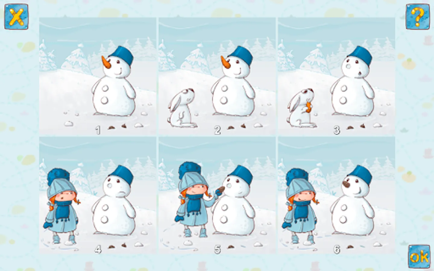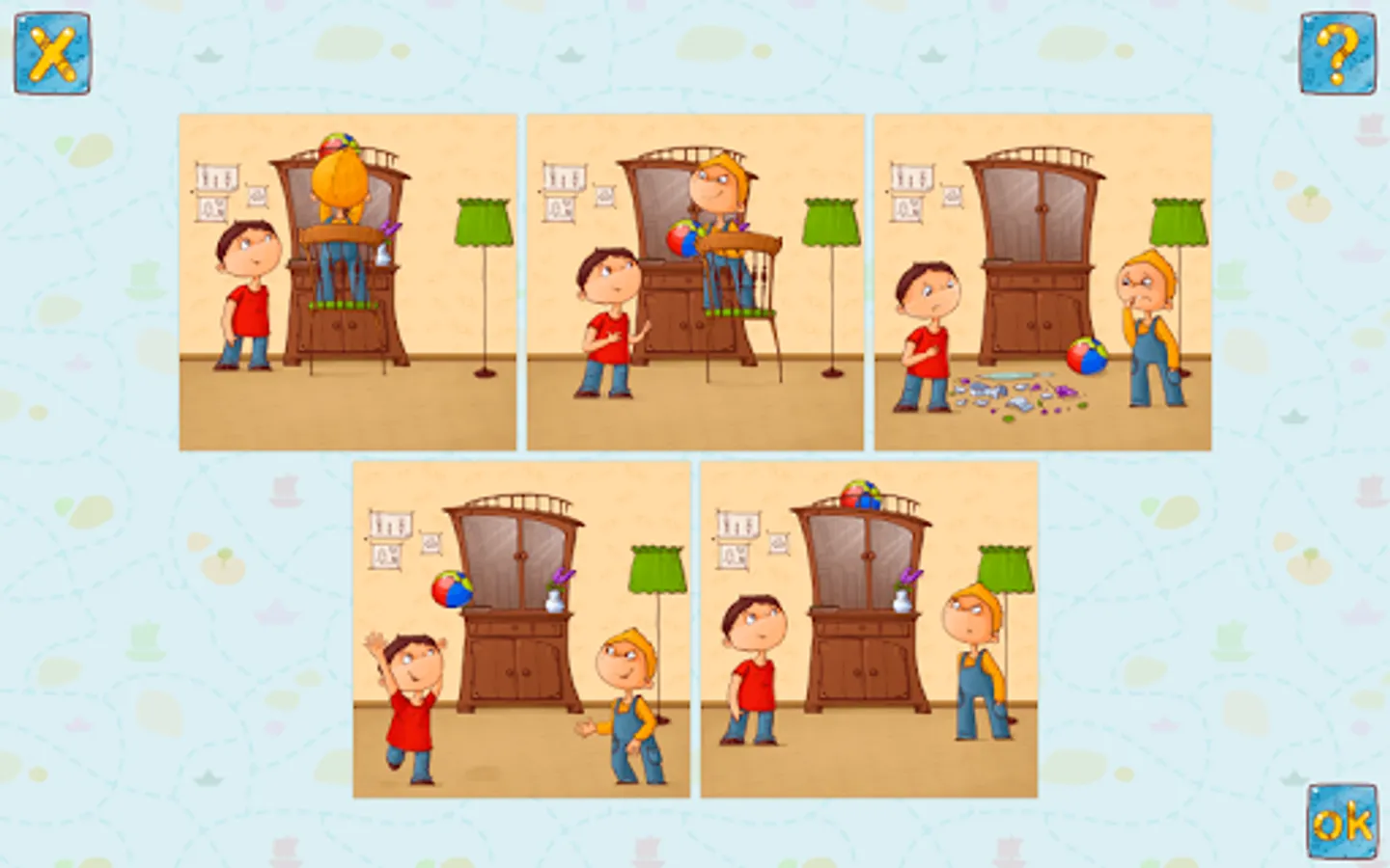 Each of the tasks presents a sequence of pictures on the screen that together tell a story, yet the pictures get mixed at the start of the round. The child has to put the pictures back into the correct order and tell the story these pictures display. The game effectively trains the ability to speak in complete and meaningful sentences as well as to come to logical conclusions based on observed facts. To place the pictures in the correct order, children need to first establish causal, temporal, spatial and other logic relationships between the smaller pieces and demonstrate a rather high level of abstraction. Examining pictures itself trains attention and concentration.