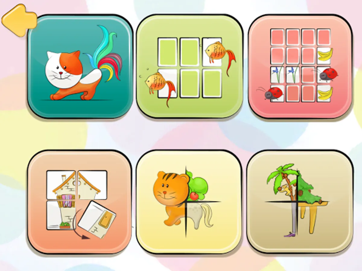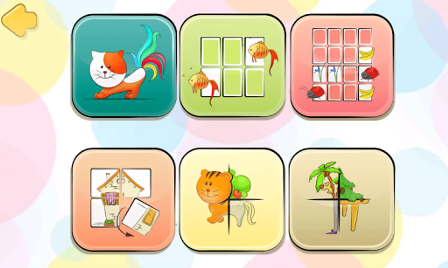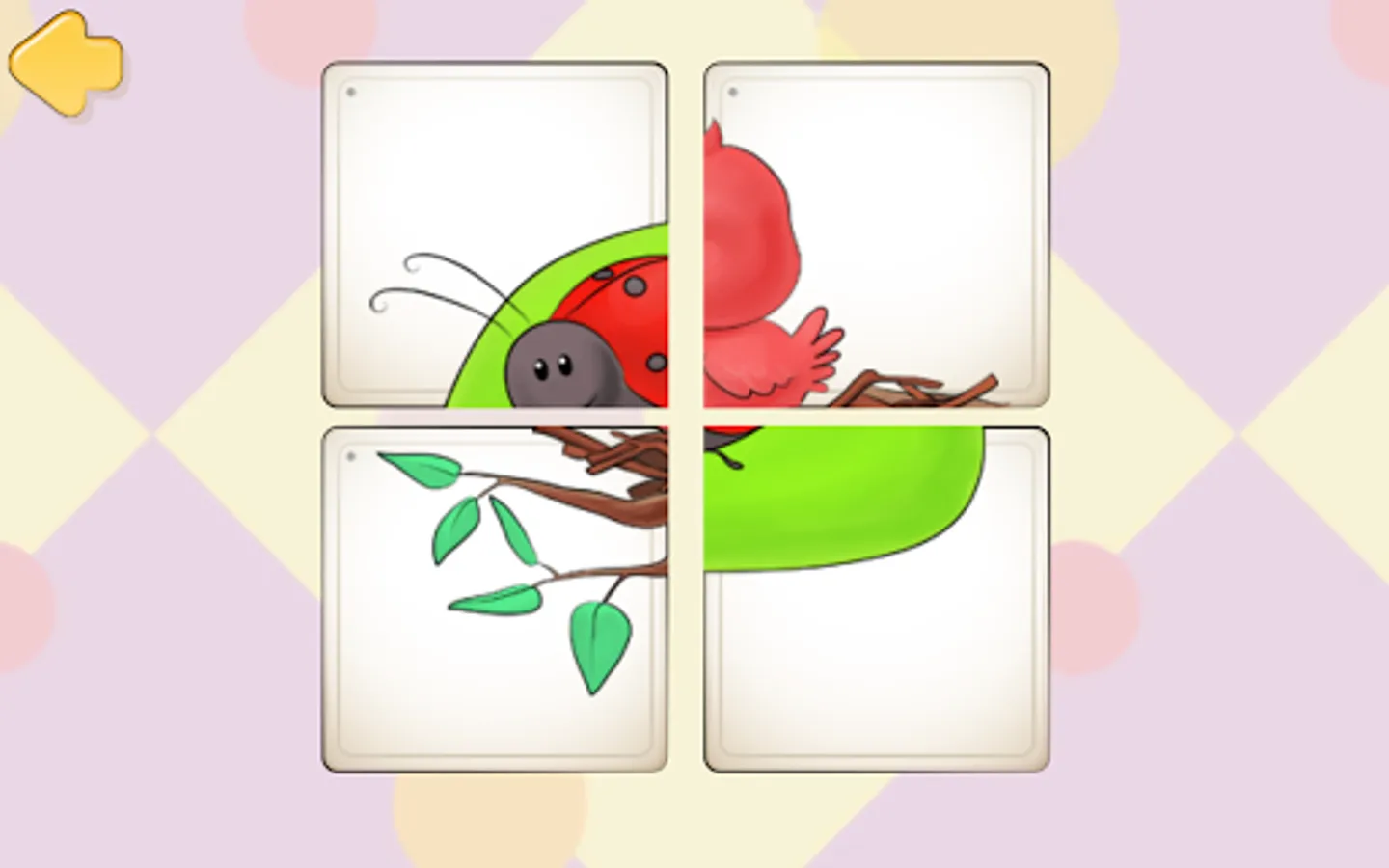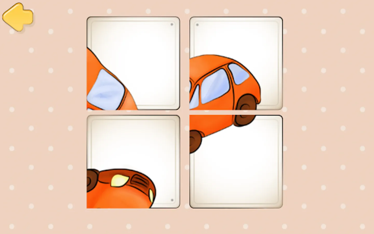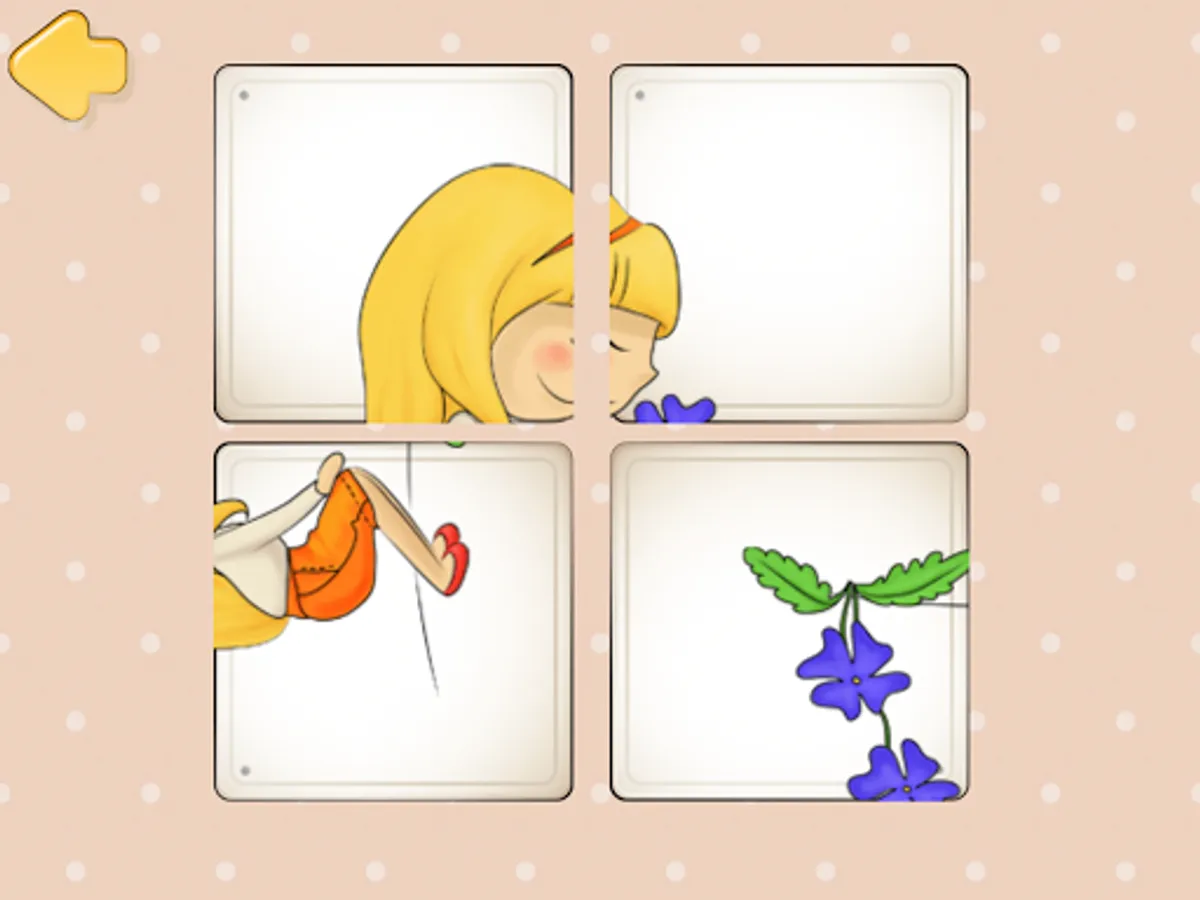 Develops spatial cognition and logic. There are four tiles on the screen, each showing a piece from a different picture. The goal is to change the pieces of pictures until all the tiles show pieces of the same picture.