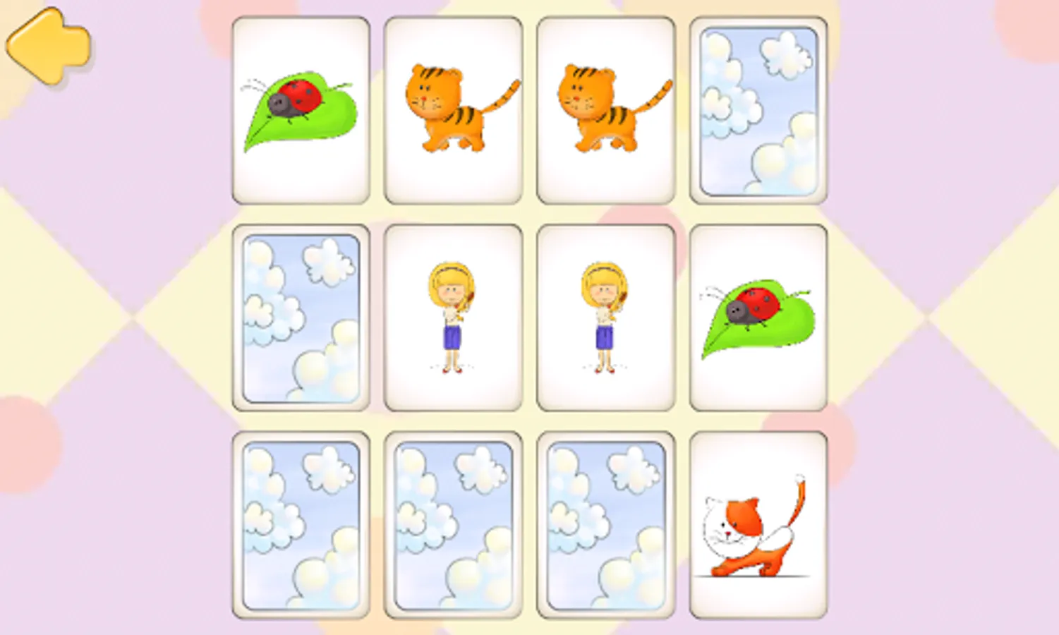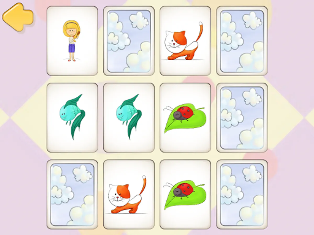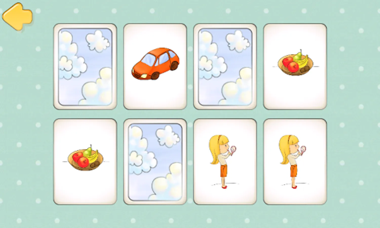 Trains attention and visual memory. There are cards on the table lying face down. Each round, the player can flip 2 cards. If the flipped cards have the same picture on the other side, they stay face up. Otherwise they get flipped back. The goal is to match all the cards.