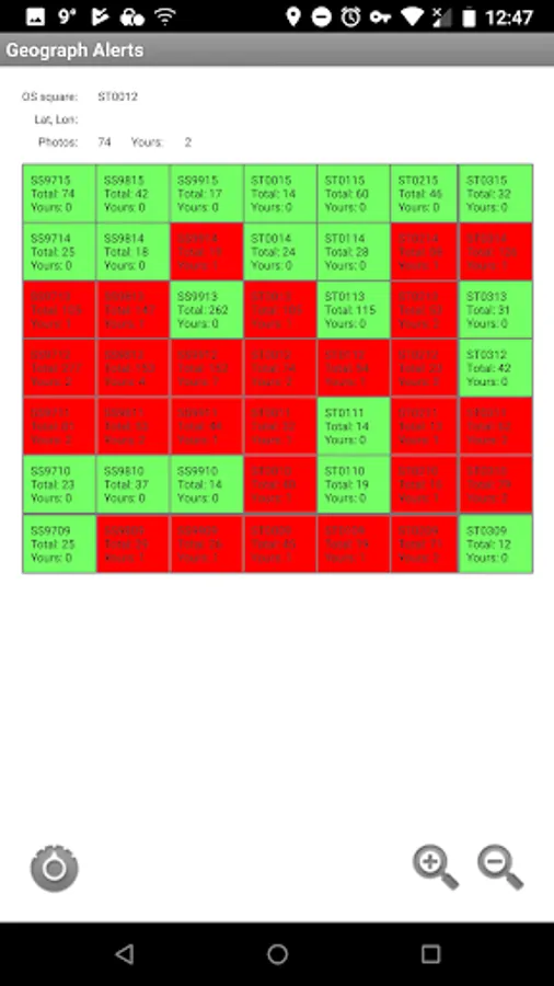 A grid of surrounding squares is shown, colour coded to show which ones you haven't yet photographed.