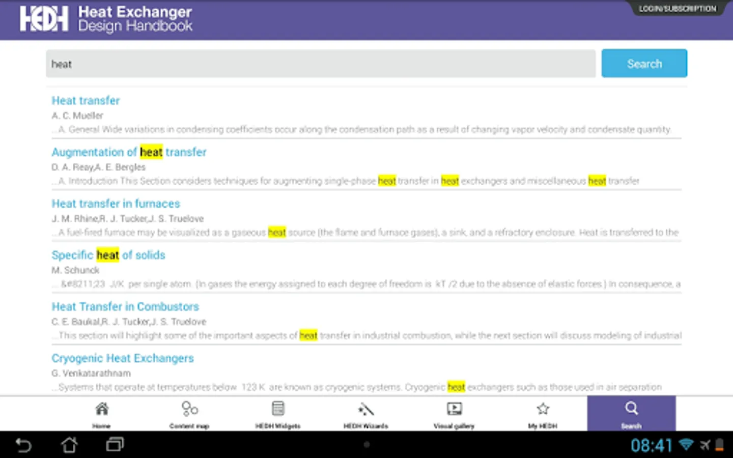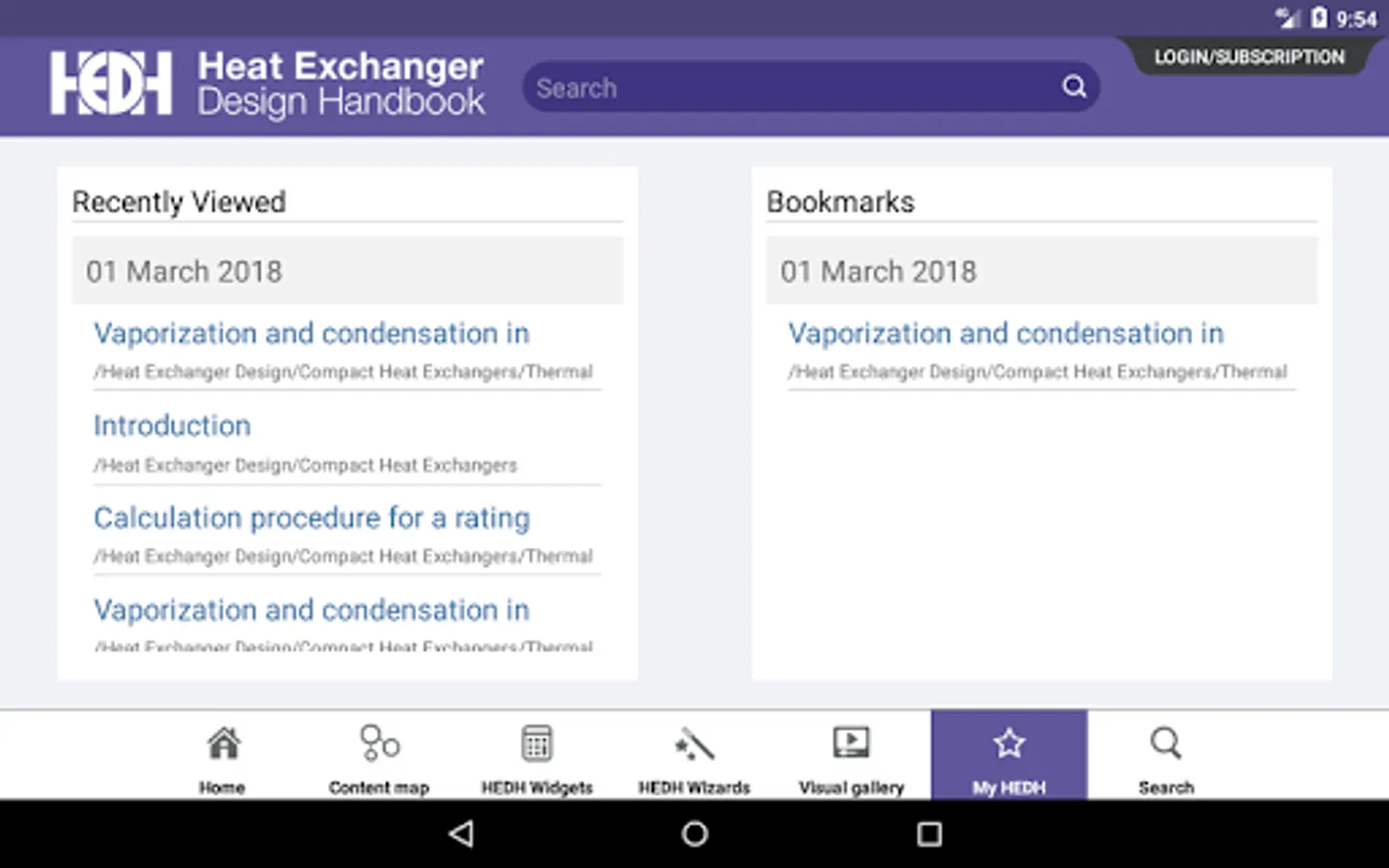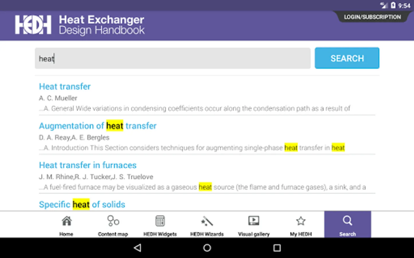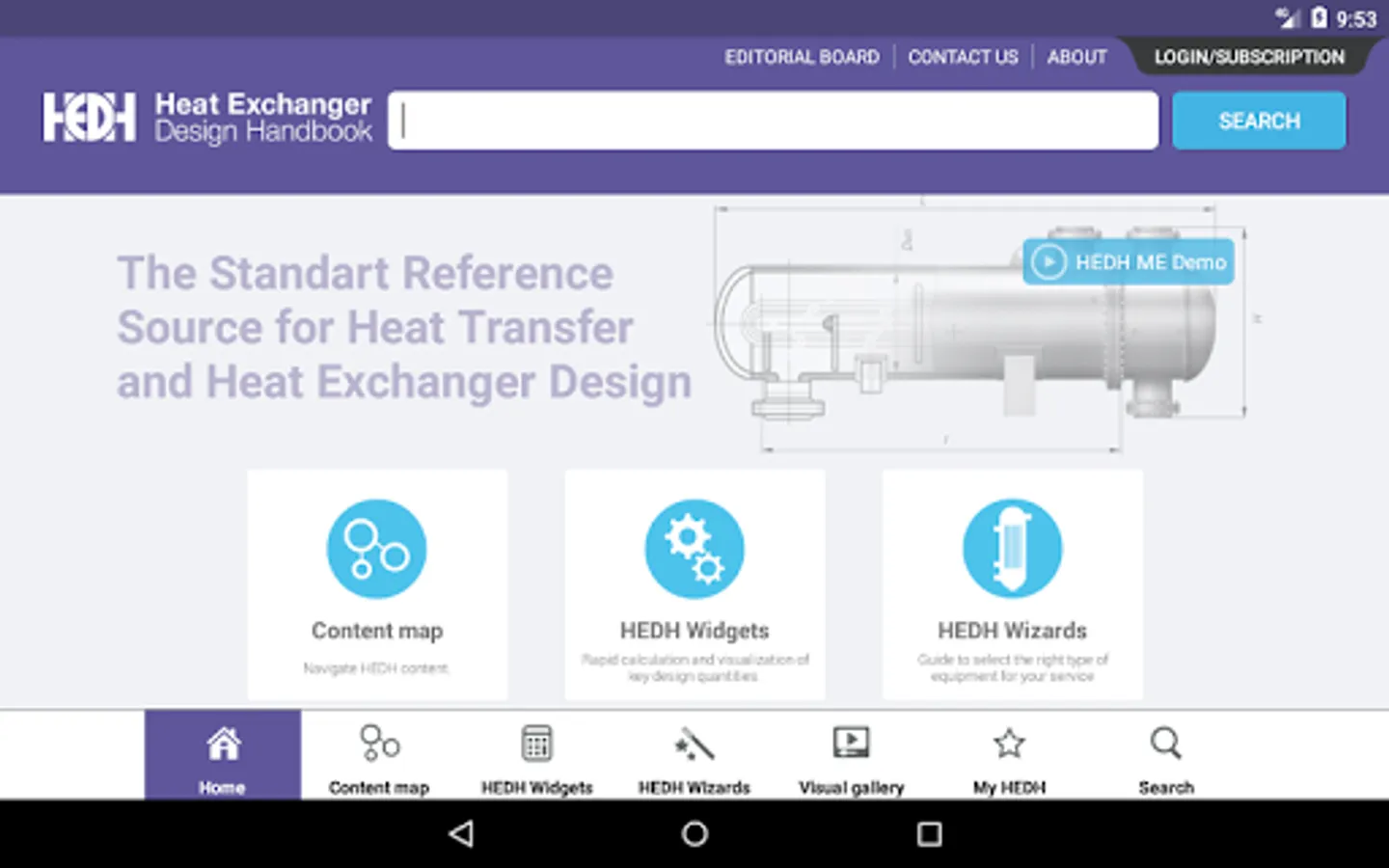 Heat Exchanger Design Handbook Multimedia Edition (HEDH ME) is the world standard reference source for Heat Exchanger Design and associate technologies. The printed edition originated in early 1980s and over the years has grown in volumes and over 6,000 pages that are peer-reviewed and quarterly updated by leading academic authorities in the field and foremost industry experts. HEDH ME is entirely converted from print to fully searchable interactive web-based product. HEDH Multimedia platform presents rigorous information in an exciting interactive HTML format with in-text unit conversion and references, 3D models of heat transfer equipment, thermal and fluid flow processes and heat exchanger operations, and simple calculators: widgets and wizards. Widgets provide quick and simple but highly effective ways of calculating key heat transfer quantities, heat exchanger design/performance parameters. Wizards guide through the selection process of the correct type of heat exchanger for a specific service and pointing to the relevant sections to complete the design of the equipment selected. HEDH Multimedia is one stop resource for: Fundamentals of heat and mass transfer, Thermo-hydraulic design, Physical properties, Mechanical design, Operations & Maintenance, Safety, integrity and reliability and Efficiency.