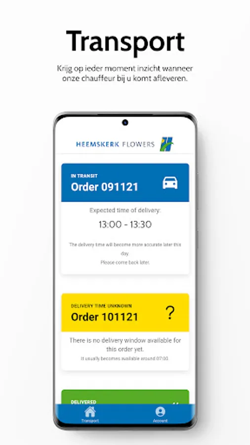 With this app you can quickly see what time we estimate that the driver today is with you. We try to do this as accurately as possible, with a window of half an hour. During the day it may still be slightly different due to traffic and other unforeseen circumstances.