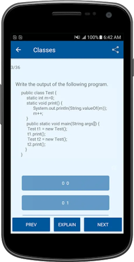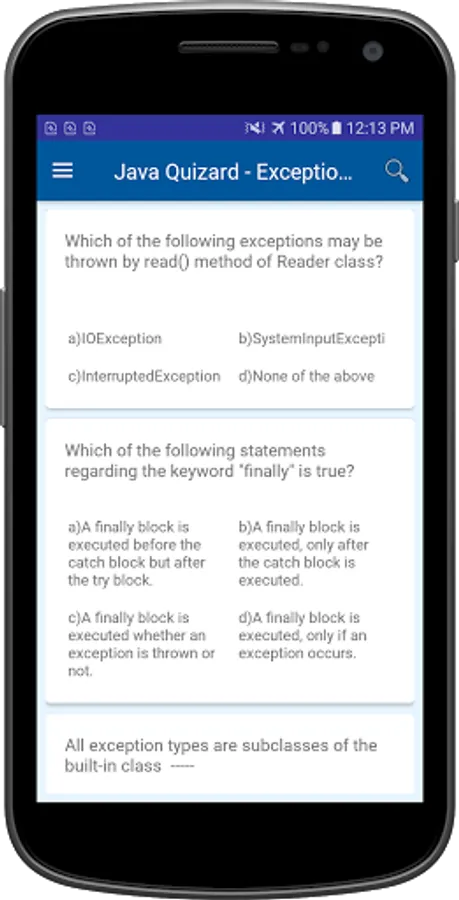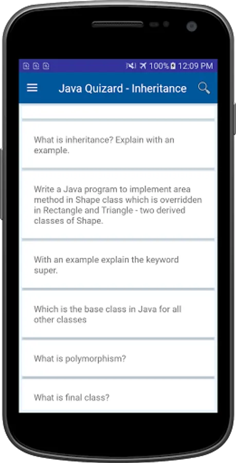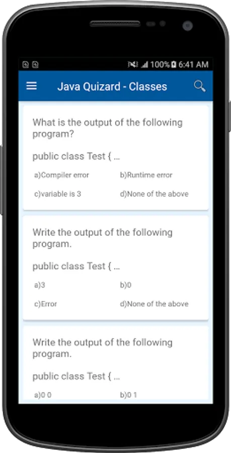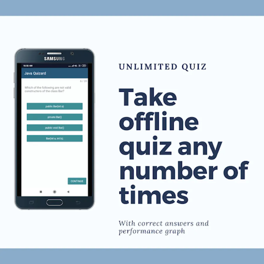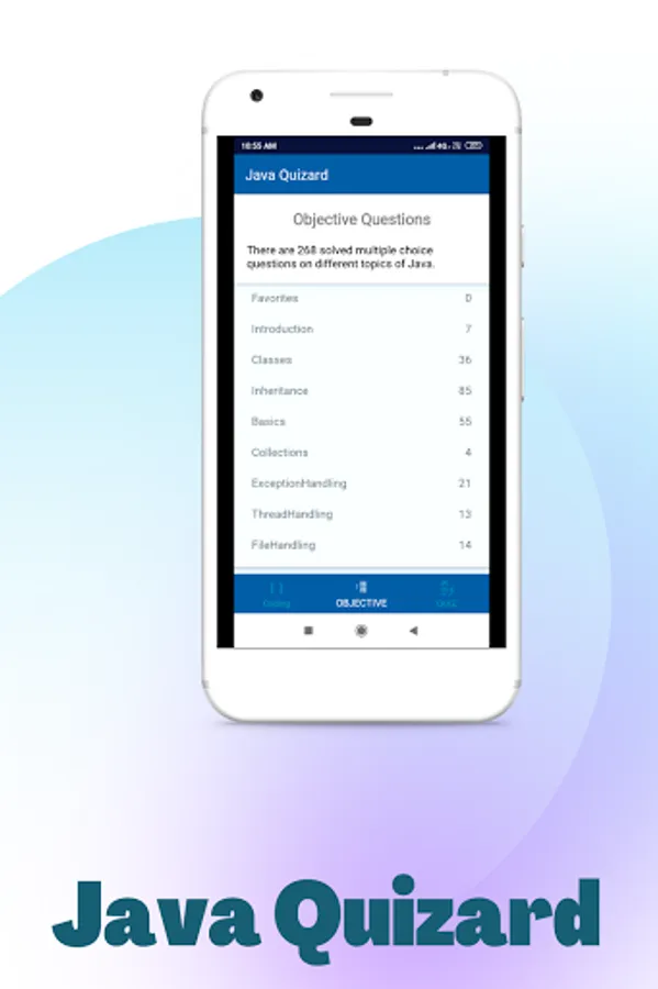 Java Quizard is a quiz app with questions and programs on Java language. It has 242 descriptive questions and 268 objective questions on various topics of Java.