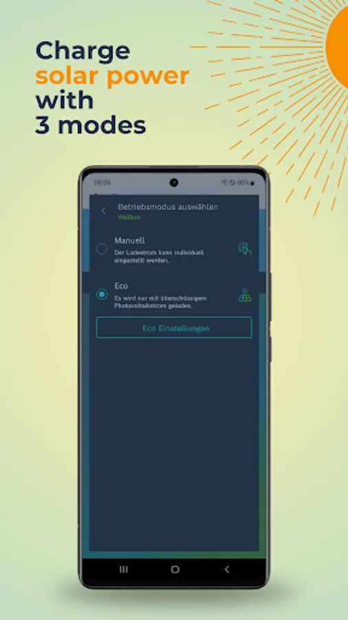 · Advanced Eco settings that allow you to draw additional power from the grid if there is insufficient PV surplus. You can set the amount of PV surplus required for charging and the charging level to be topped up to. The difference between these settings is adjusted automatically.