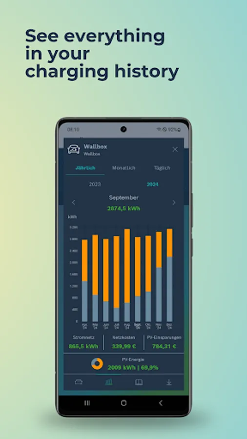 · Charging and consumption analysis: Track your charging history, solar power and grid consumption as well as costs and savings. Download the data as a CSV file and receive cost estimates.