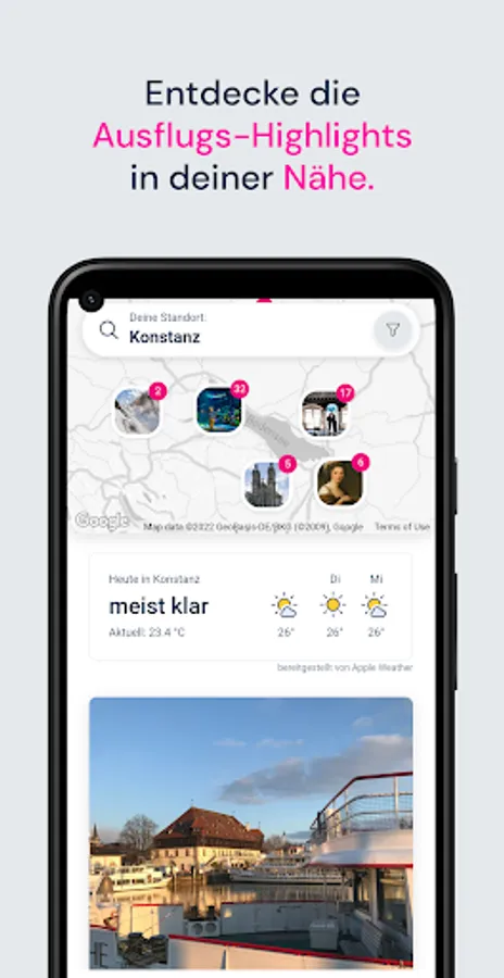 We will help you to find great excursion destinations for your Lake Constance holiday. It doesn't matter whether it's Konstanz, Friedrichshafen, Lindau, Meersburg or anywhere else. You always see the targets that are closest to your location.