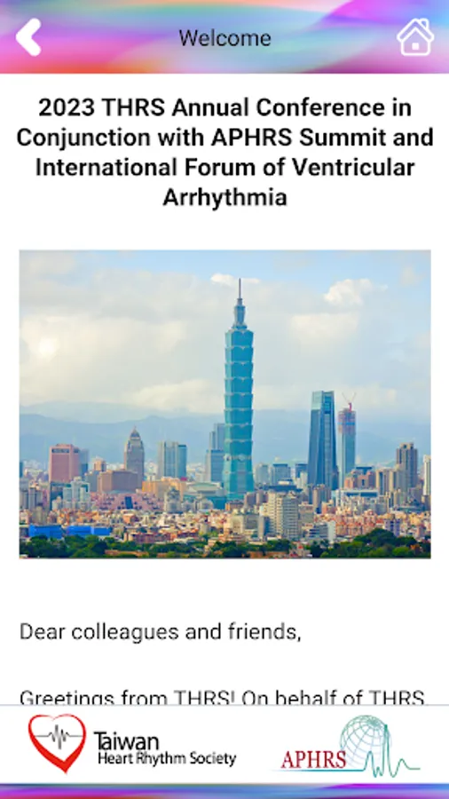 Greetings from THRS! On behalf of THRS, we would like to extend my most heartfelt welcome to you for attending the 2023 THRS Annual Conference in Conjunction with APHRS Summit and International Forum of Ventricular Arrhythmia which will be a physical conference from March 18 to 19, 2023 in Taipei, Taiwan.