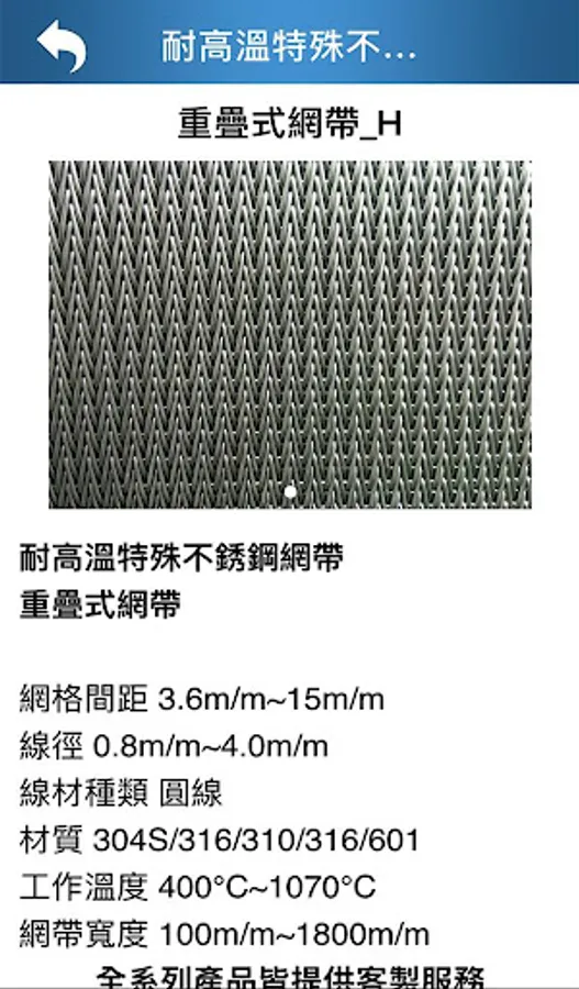 (一)耐高溫特殊不銹鋼網帶 : 力骨式網帶、重疊式網帶、細目重疊式網帶、直心力骨式網帶。(二)不鏽鋼網帶 : 力骨式網帶、重疊式網帶、金屬線輸送網帶以及各種用途之金屬網帶之客製化製造。