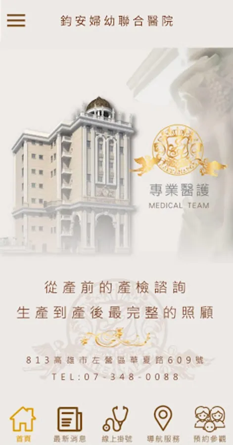 鈞安婦幼聯合醫院設於左營區華夏路609號,擁有最雄偉的建築,最先進的設備,最高端的品質,最人性化的服務。