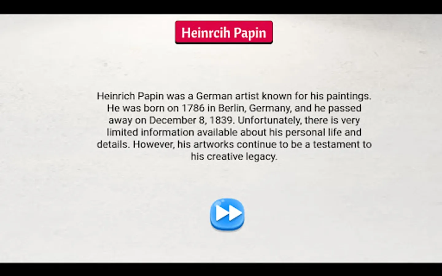 Heinrich Papin was a German artist known for his paintings. He was born on 1786 in Berlin, Germany, and he passed away on December 8, 1839. Unfortunately, there is very limited information available about his personal life and details. However, his artworks continue to be a testament to his creative legacy.