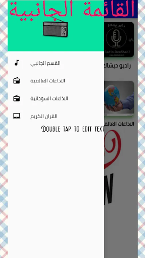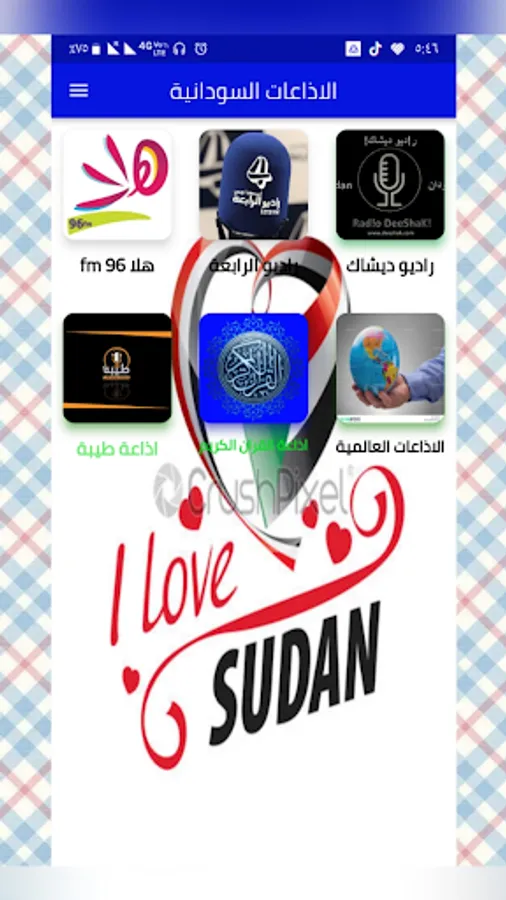 The application is dedicated to radio stations, as the application contains a large group of Sudanese radio stations (Radio Hala 96, Radio Al-Rabaa, Radio Al-Quran, Radio Taiba, and Dishak).