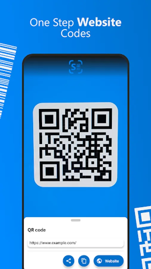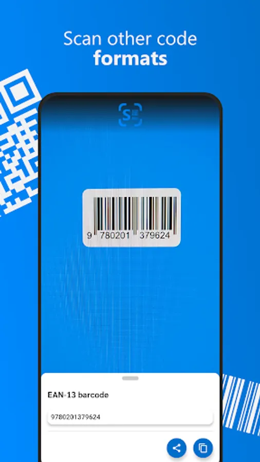 QR and barcode scanner, with basic options to quickly share, copy or go to the code website.
