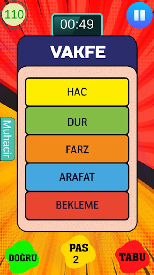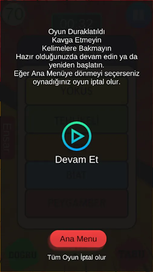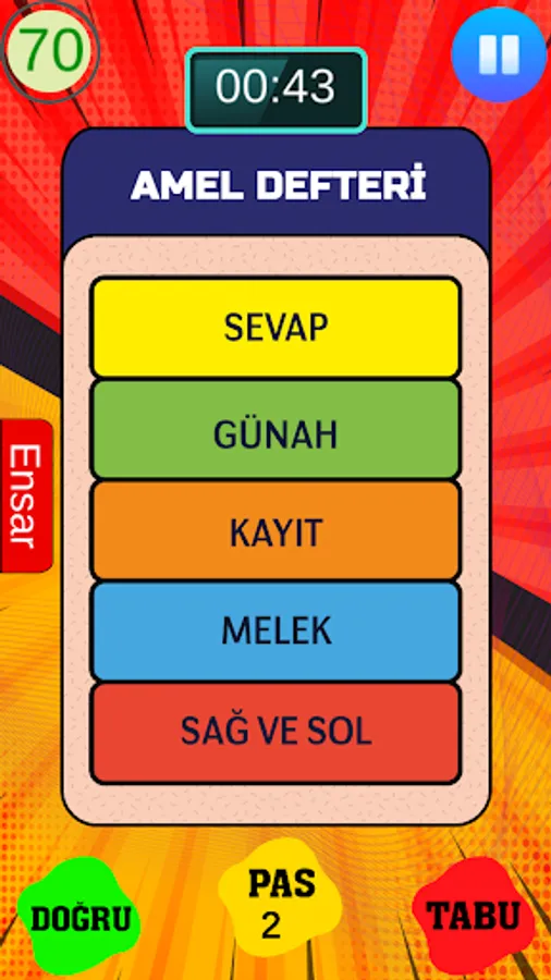 In the Islamic Taboo game, you will try to explain the concepts or words within the Islamic criteria without using the 5 prohibited words. You will both have fun and learn in the Islamic Taboo game played with 2 teams. Come easy for everyone in our game that is played with at least 4 people.